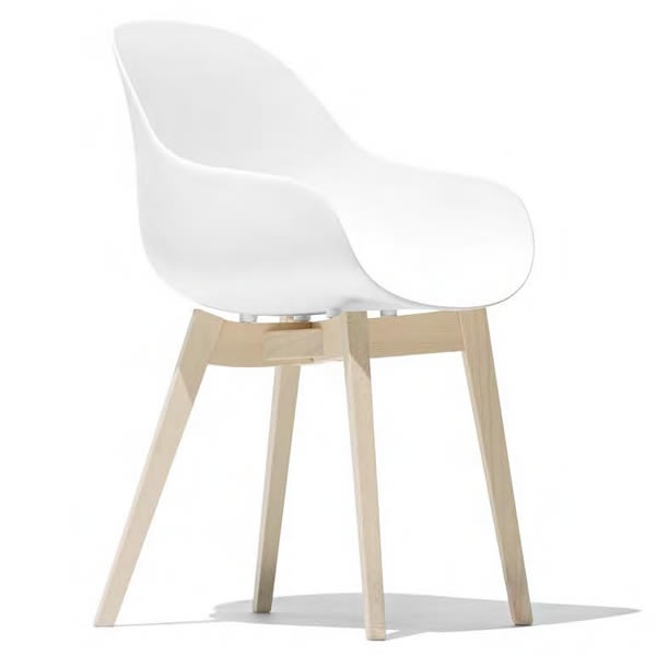 Academy è la poltroncina must-have per chi desidera comfort e stile in un unica seduta. Realizzata in polipropilene riciclato per il massimo della praticità, si combina ad un fusto 4 gambe in legno.