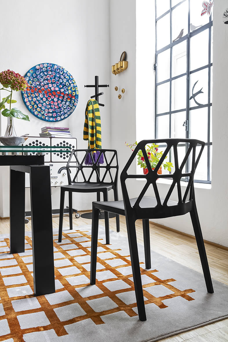 La sedia Alchemia, completamente realizzata in polipropilene, è disponibile nelle seguenti colorazioni: timo opaco, nero opaco, bianco ottico opaco, sky blue opaco, canapa opaco, nocciola opaco, tortora opaco, senape opaco.