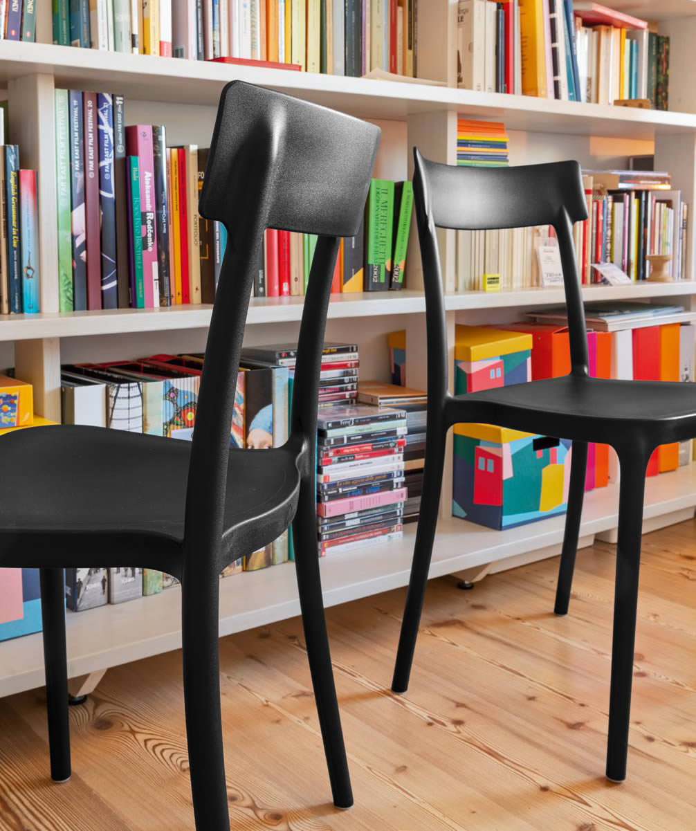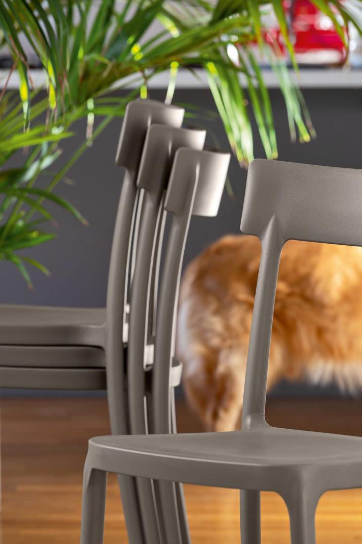 La sedia ARGO, realizzata interamente in polipropilene, impilabile fino ad un massimo di 4, è adatta anche per l'uso esterno.