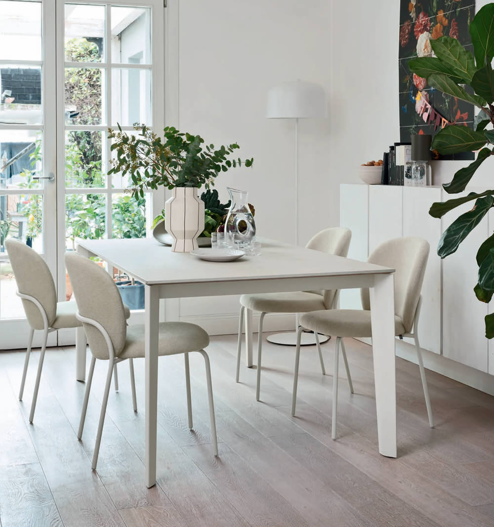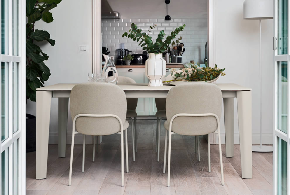 Tavolo rettangolare allungabile con piano in nobilitato e gambe in metallo.