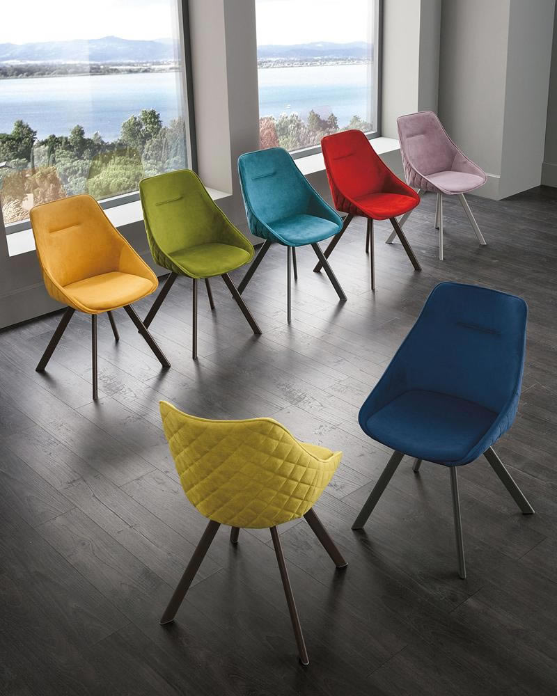Sedia imbottita e rivestita in morbido Easy-Touch o microfibra con struttura in metallo verniciato. Disponibile anche con seduta girevole.