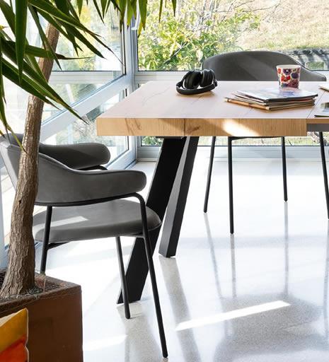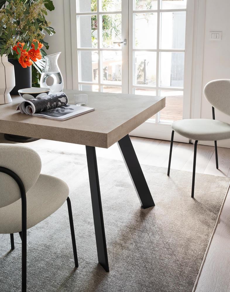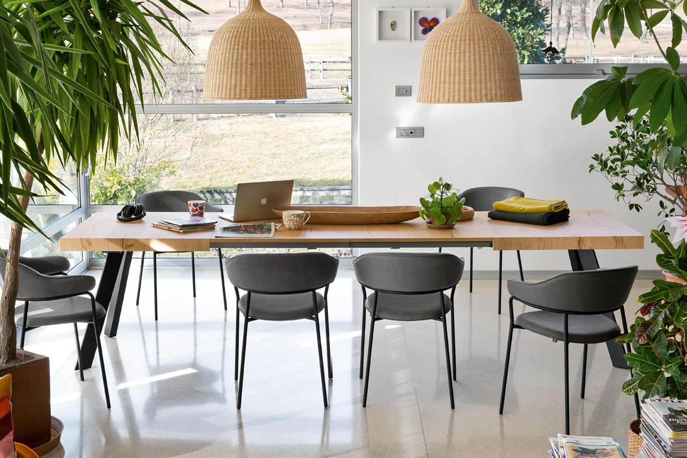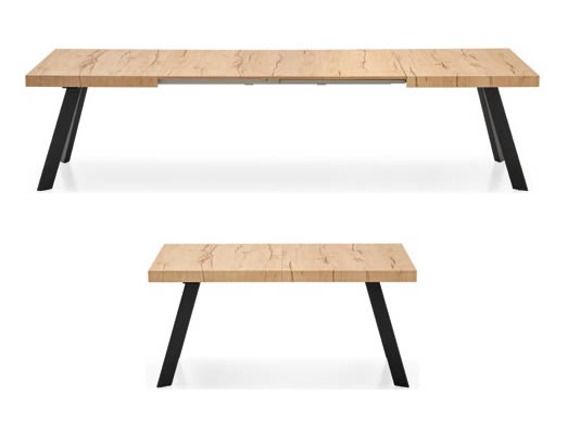 Tavolo allungabile con gambe colore nero in legno di faggio e piano in nobilitato. Il sistema di allunga centrale prevede che le gambe ed il cassonetto si divarichino, rendendo accessibile il cassetto interno che alloggia tre allunghe indipendenti. Le stesse consentono di allungare, a piacimento, il tavolo in tre diverse lunghezze a seconda dell'esigenza. Le guide in alluminio garantiscono un'ottima stabilità.