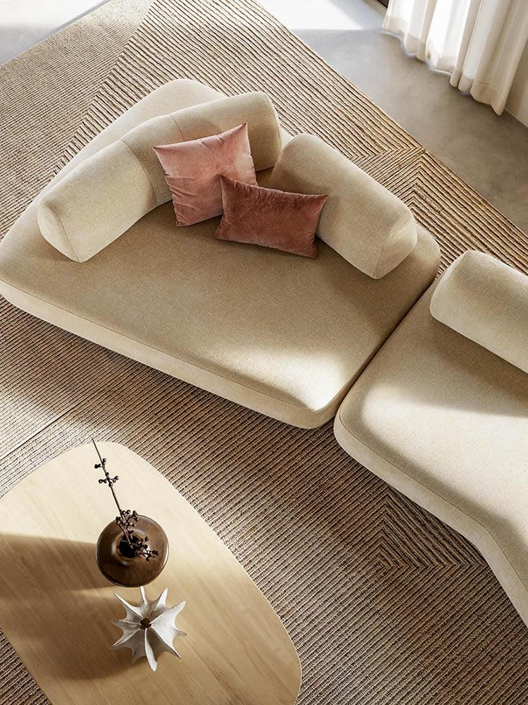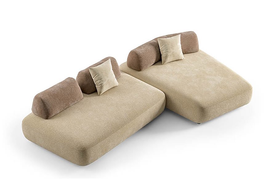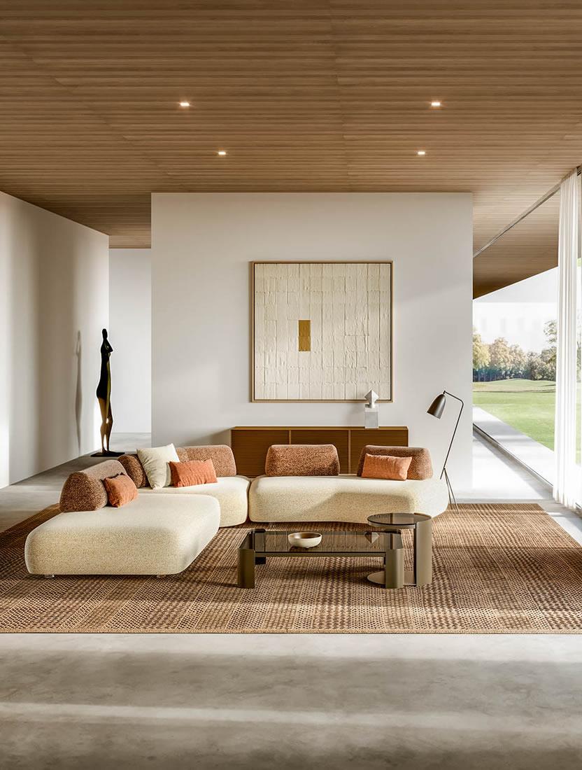 Capriccio nasce come sistema di sedute modulare: ti consente di combinare liberamente basi lineari, sagomate o a 45°, schienali e cuscini in modo da creare composizioni sempre diverse che spaziano da ampie configurazioni con più moduli collegati, a configurazioni completamente indipendenti.