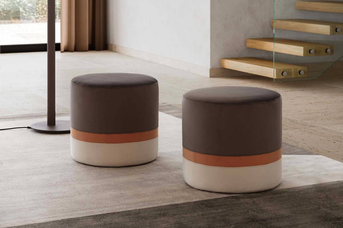 Pouf rotondo, completamente sfoderabile, con rivestimento suddiviso in fasce tricolore.