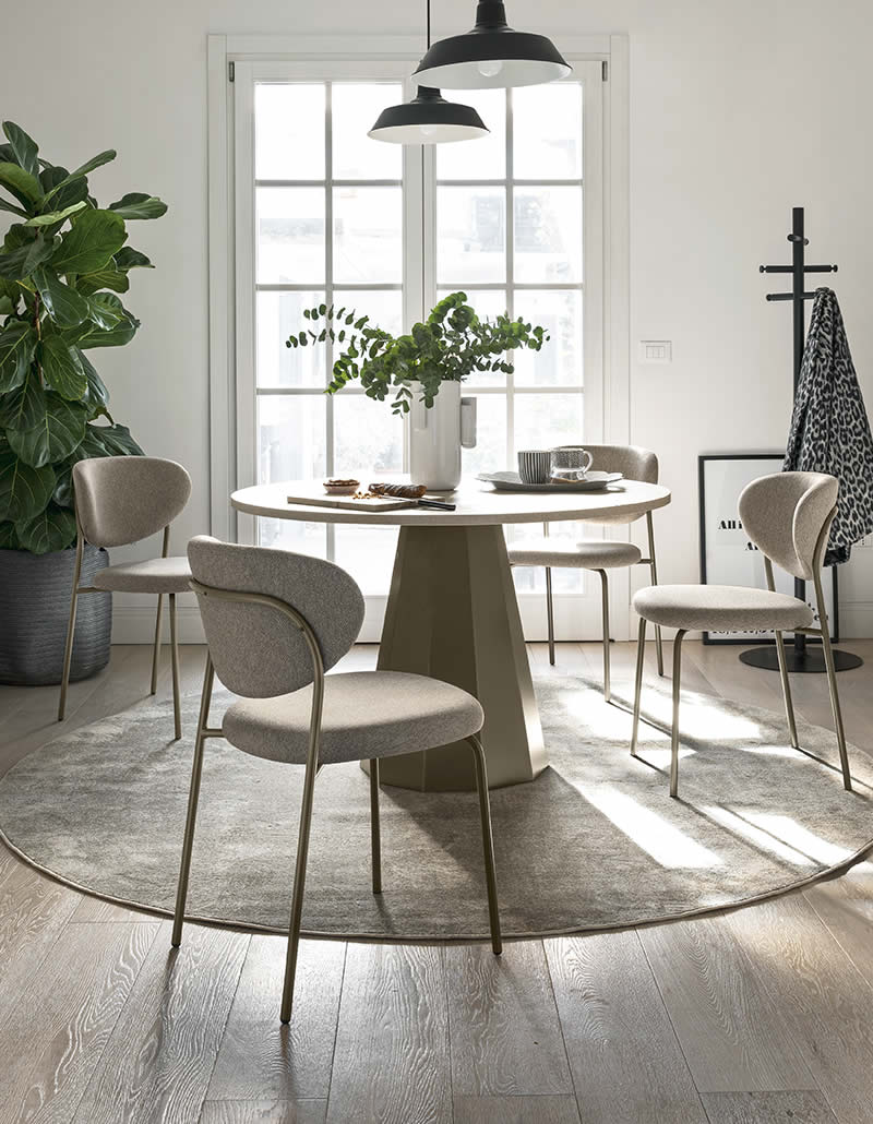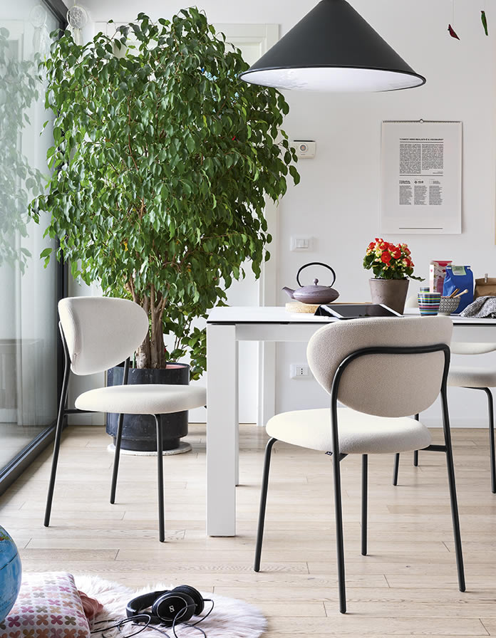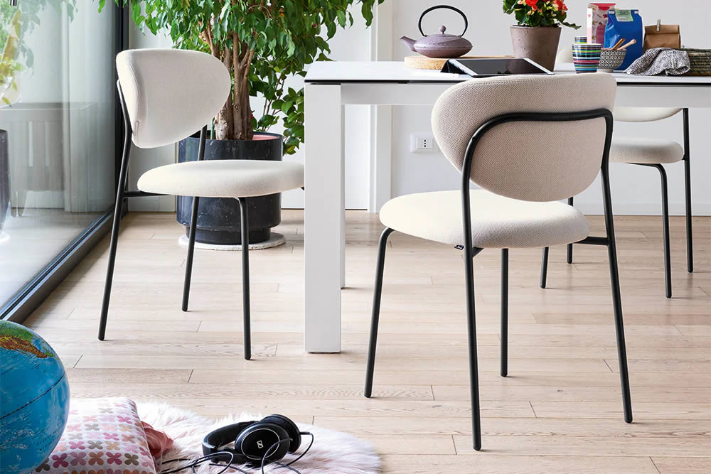 Caratterizzata da un colorato fusto in metallo e da sedile e schienale imbottiti rivestiti in tessuto, la sedia Cozy rappresenta versatilità e leggerezza.