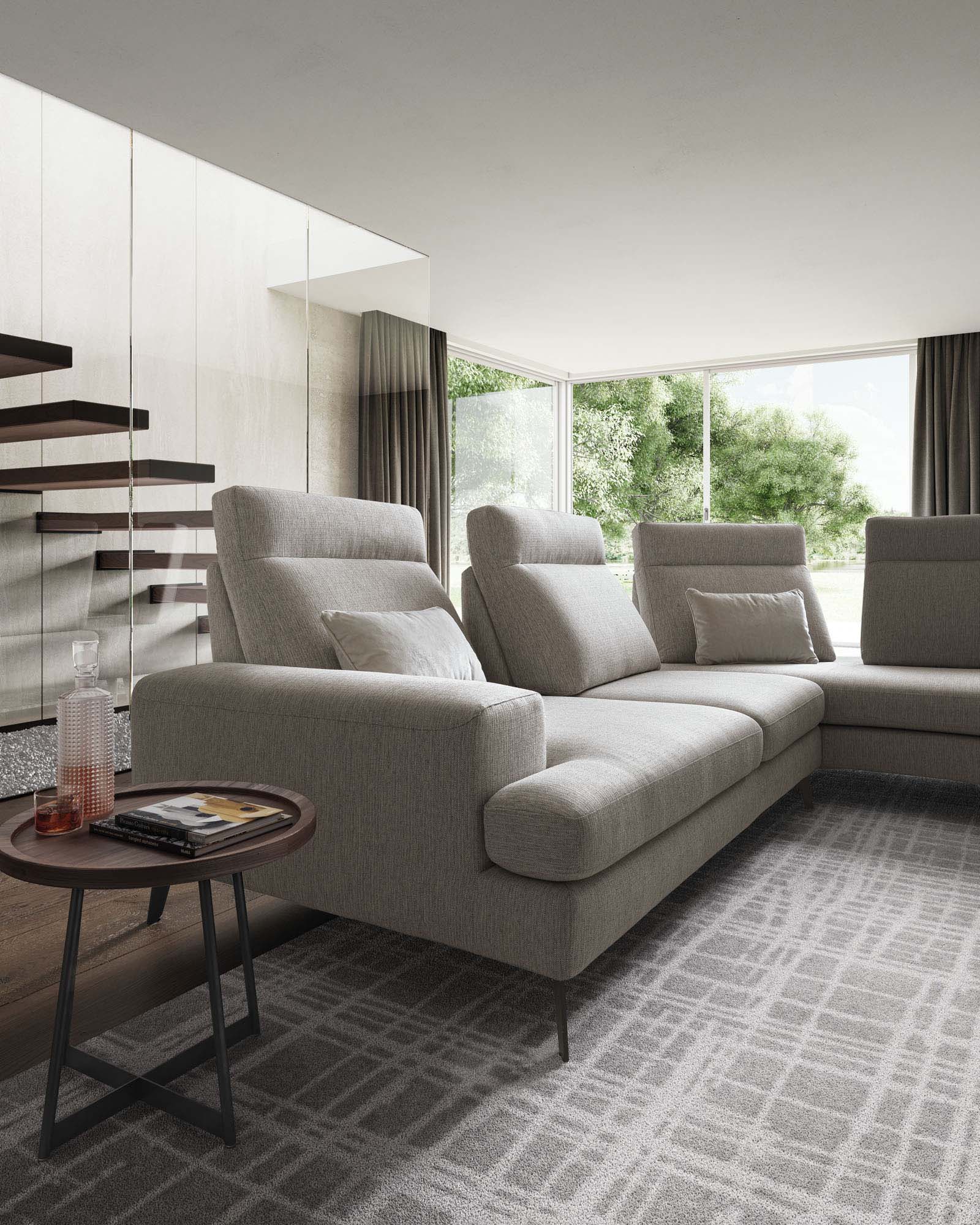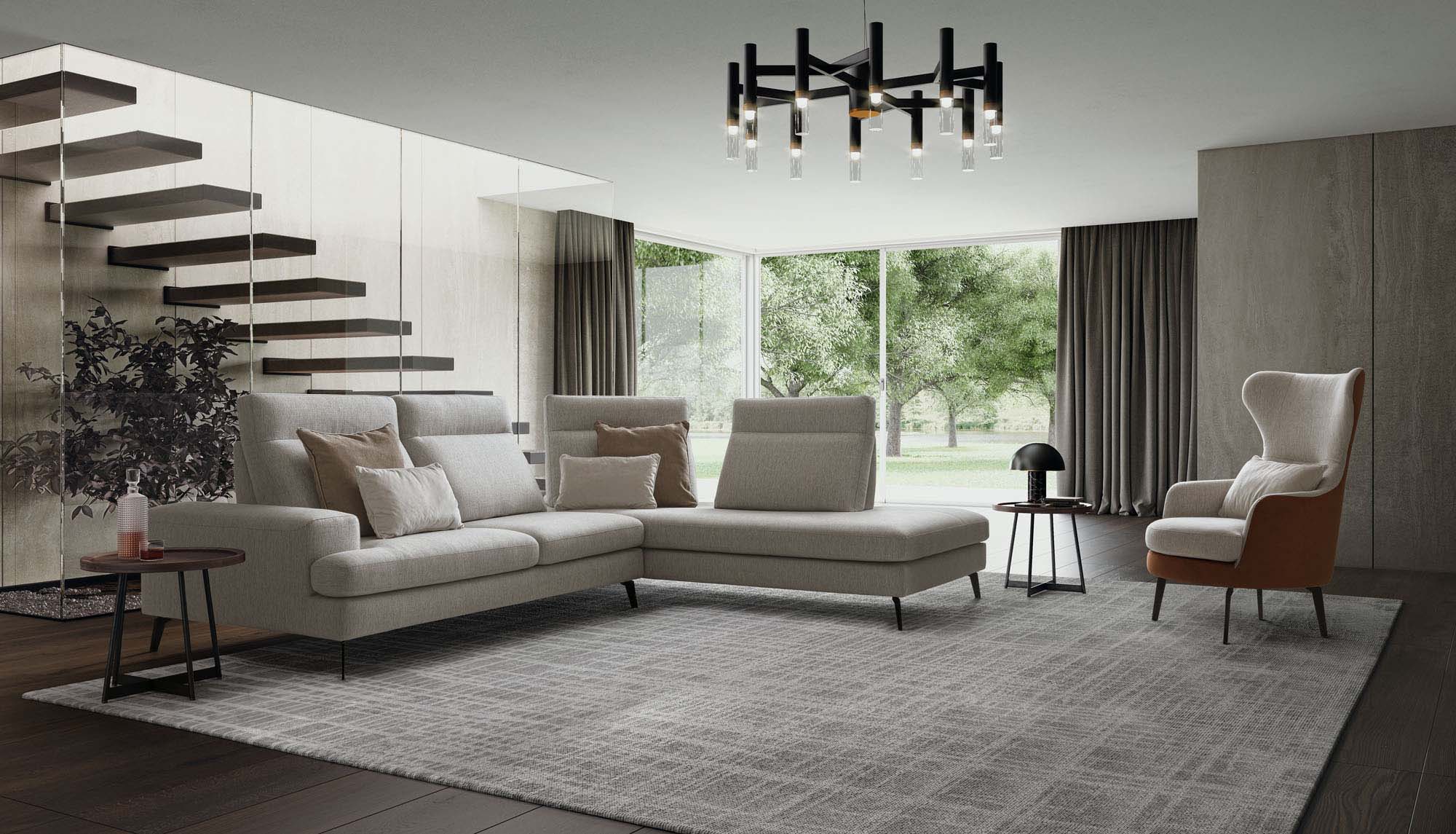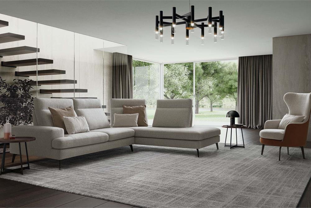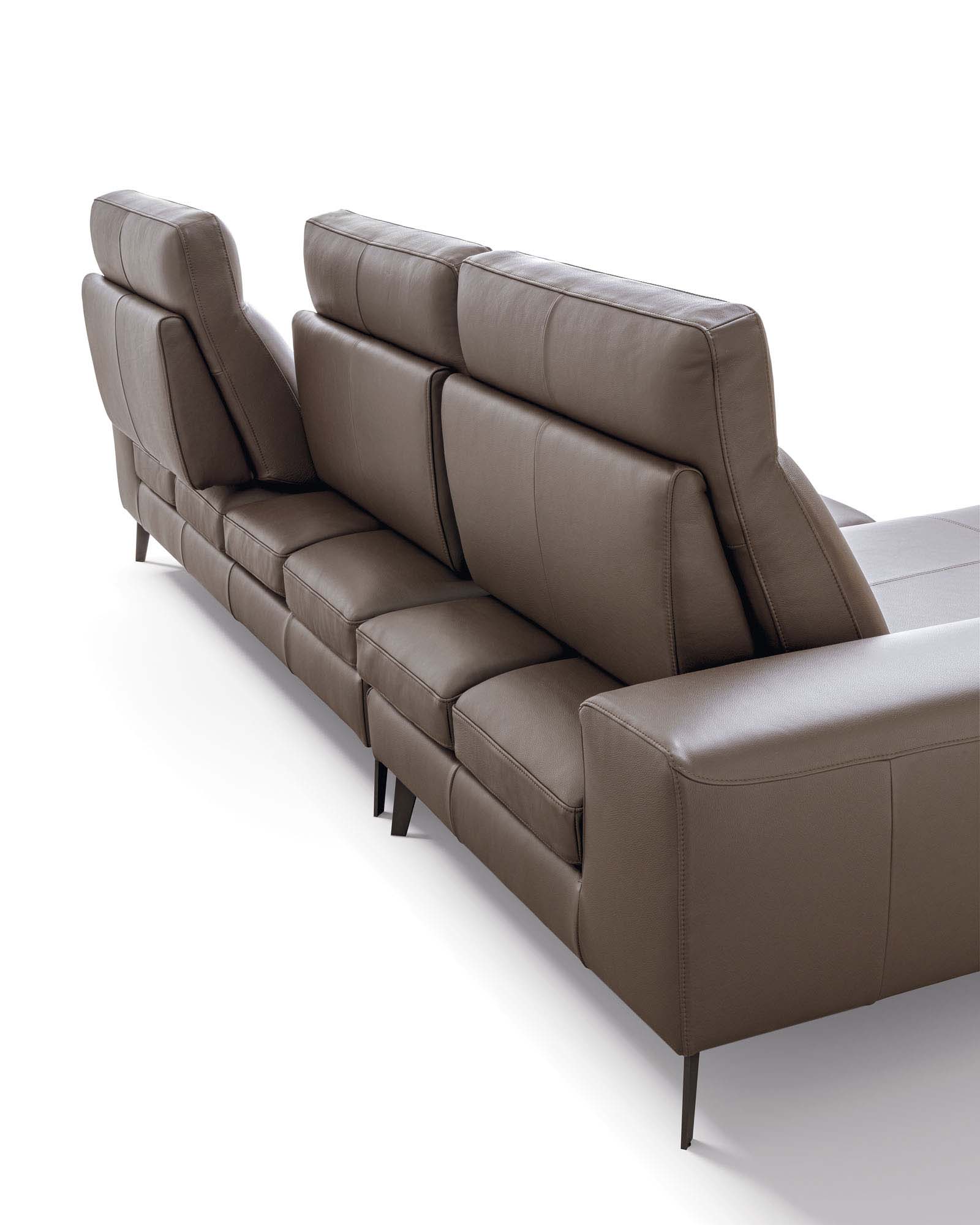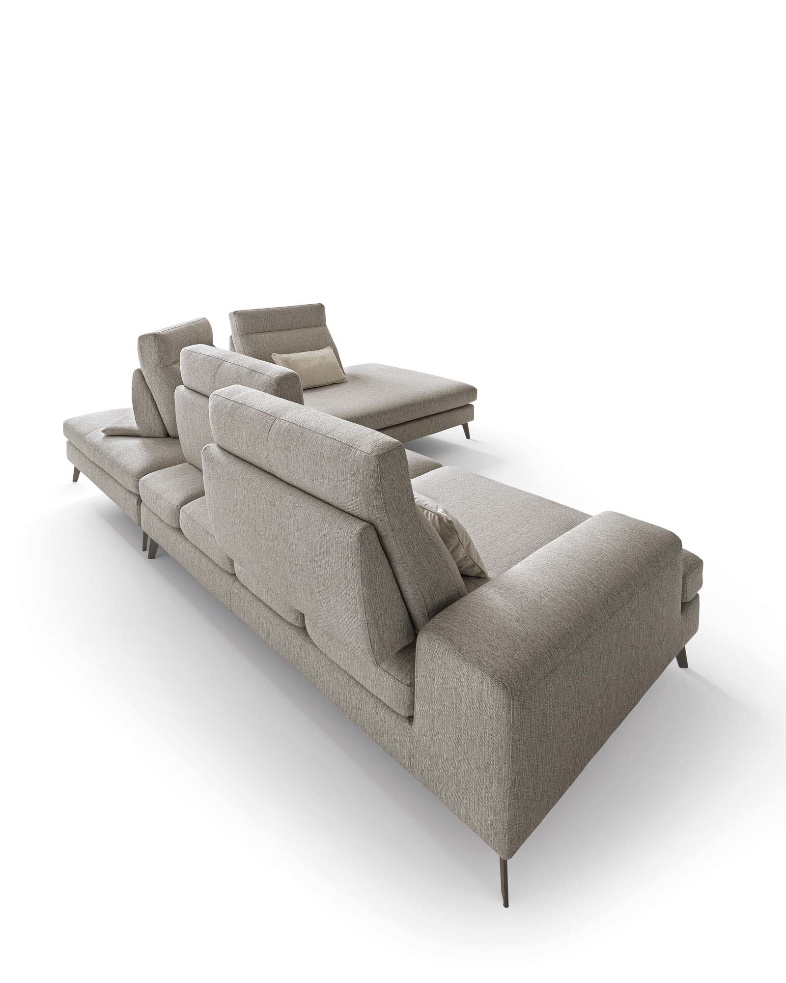 Frontalmente, grazie al particolare meccanismo traslante, gli schienali modificano la profondità delle sedute, per arrivare anche a scomparire sul laterale angolare in forza della loro amovibilità.