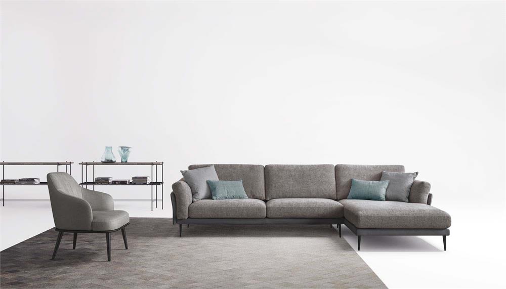 Un guscio esterno soffice ed elegantemente rifinito abbraccia l’anima in tessuto di Nicole, divano dal rivestimento composito che dona un tocco non convenzionale a un modello dall’impianto arioso, slanciato dagli alti e raffinati piedini.