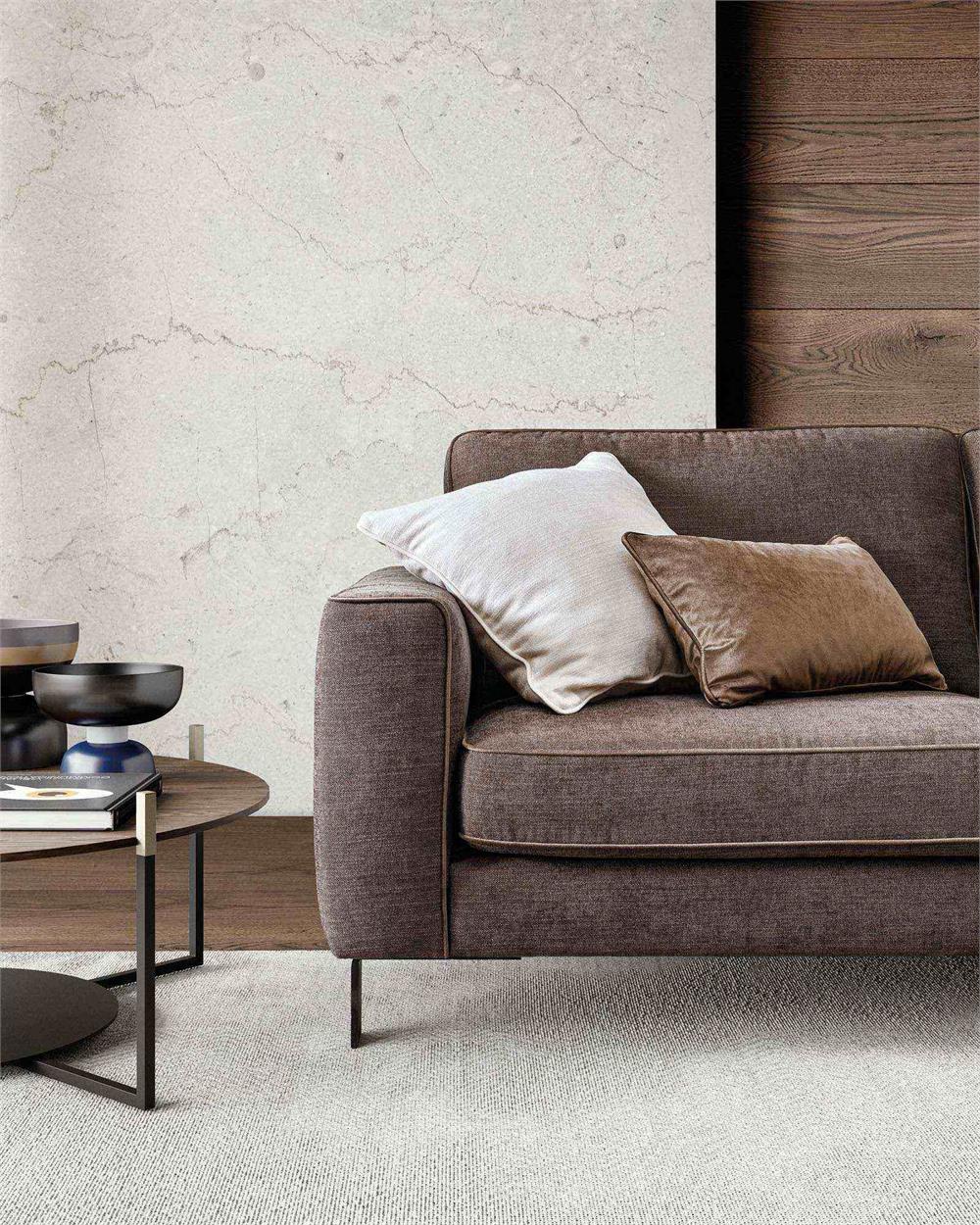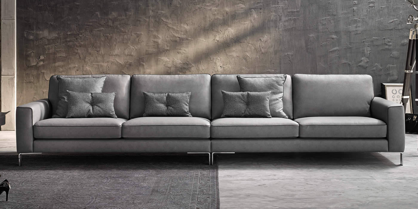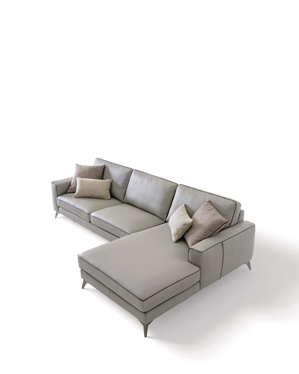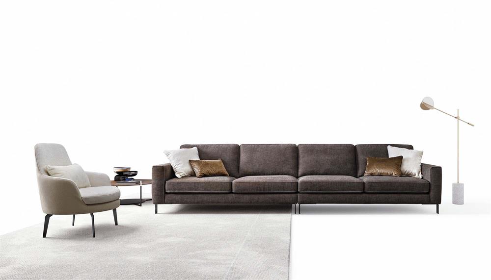 Evidenziare il perimetro del salotto di casa, per farne risaltare profondità e ampiezza, questa è la missione di Russel, divano che fa dello slancio il suo principio compositivo, evidenziato dagli eleganti piedini dal profilo sottile.