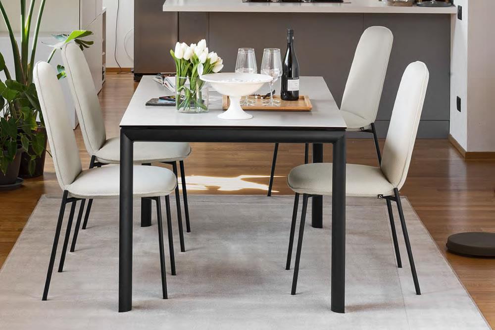 Allungabile con fianchi a sezione arrotondata in metallo verniciato. Ha una allunga interna che si rivela tirando il tavolo dal ponte gambe grazie alle pratiche rotelle nascoste. L'ampiezza delle combinazioni e dimensioni creano un tavolo versatile capace di adattarsi ad ogni esigenza estetica e funzionale.