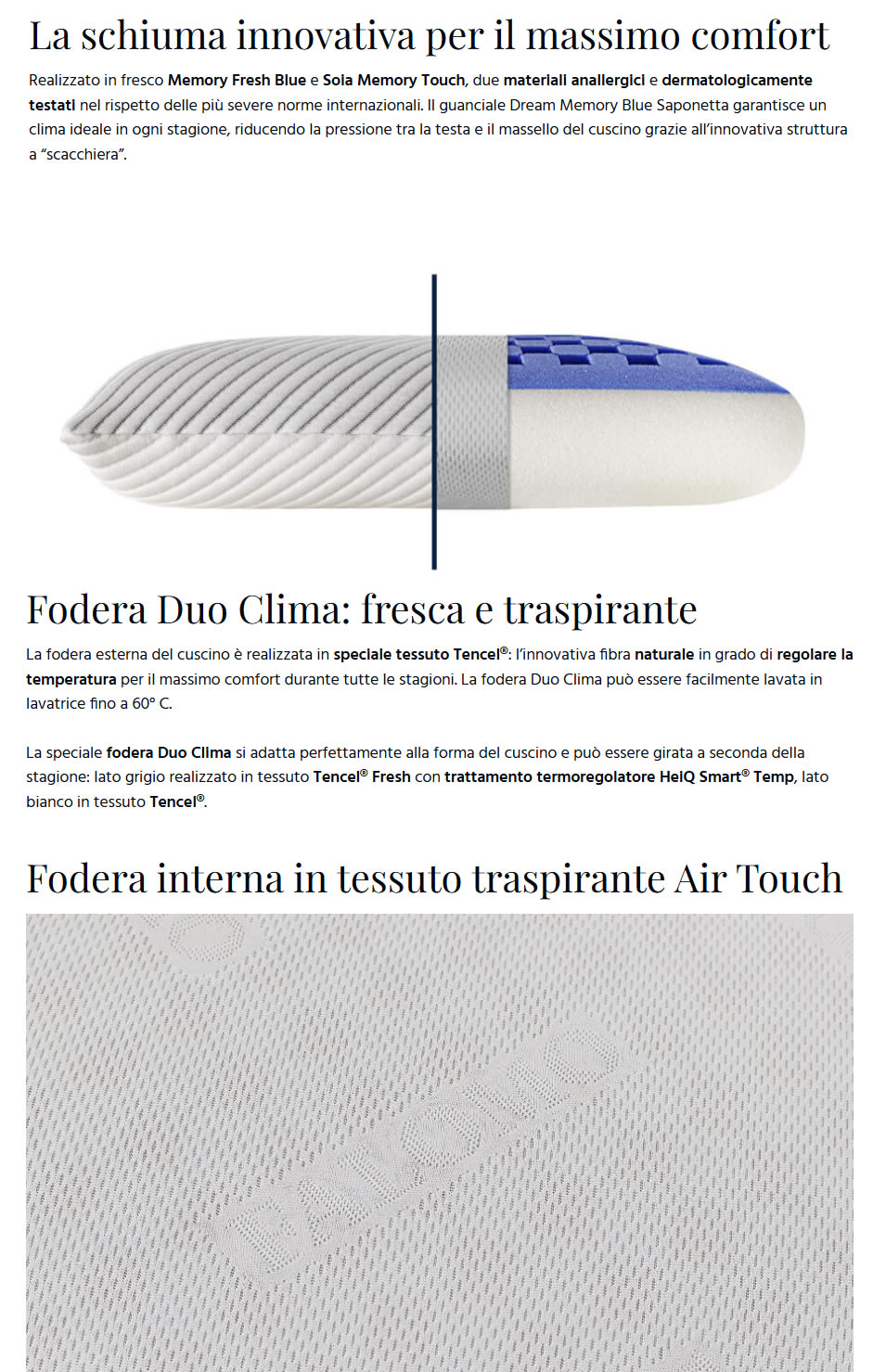 Realizzato in fresco Memory Fresh Blue e Soia Memory Touch, due materiali anallergici e dermatologicamente testati nel rispetto delle più severe norme internazionali. Il guanciale Dream Memory Blue Saponetta garantisce un clima ideale in ogni stagione, riducendo la pressione tra la testa e il massello del cuscino grazie all’innovativa struttura a “scacchiera”.