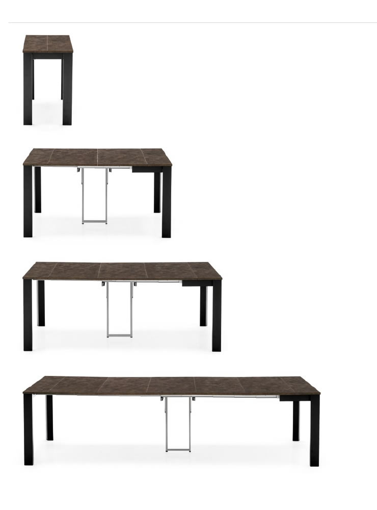 Tavolo consolle modello EMINENCE CONSOLLE. Struttura in metallo e piano in nobilitato. Consolle adattabile alle diverse misure multiple di 50 cm. La stabilità è garantita anche nella massima apertura del piano (300 cm) grazie alla quinta gamba centrale. Le allunghe non utilizzate vengono conservate in un’apposita cartellina di materiale plastico.