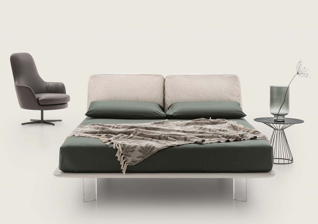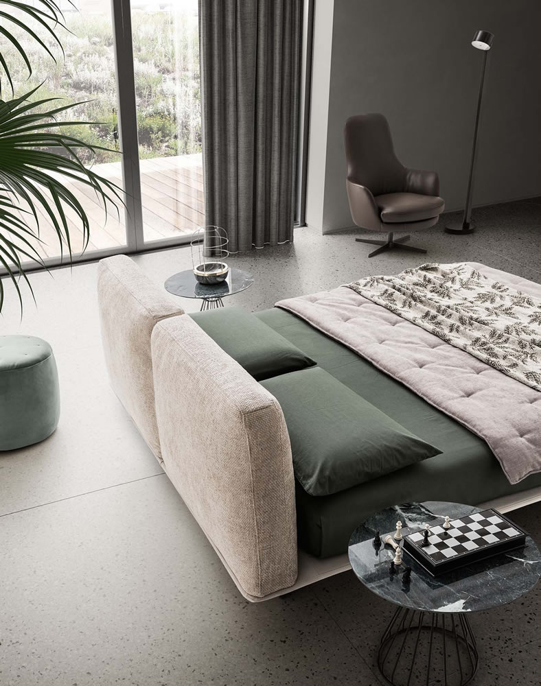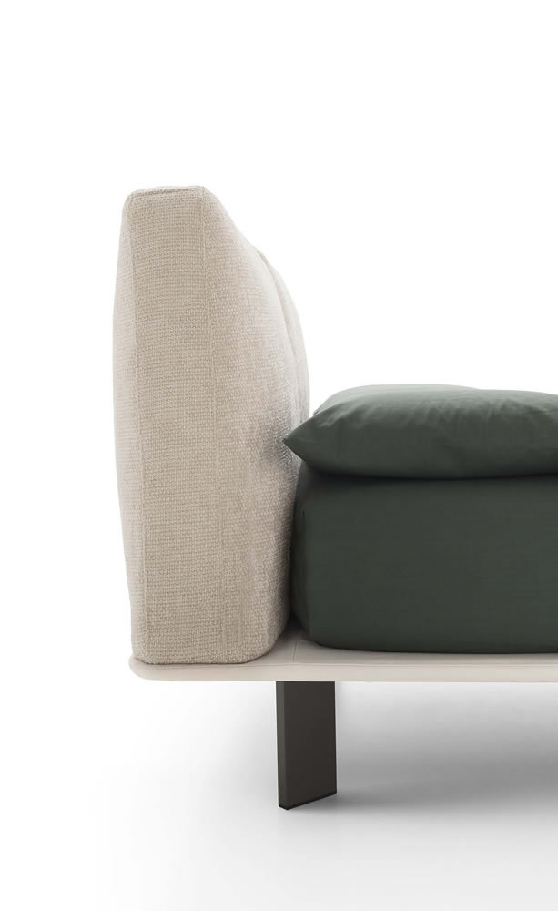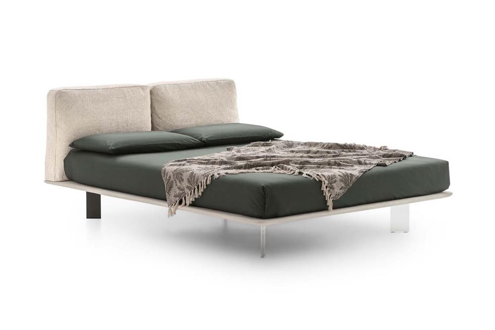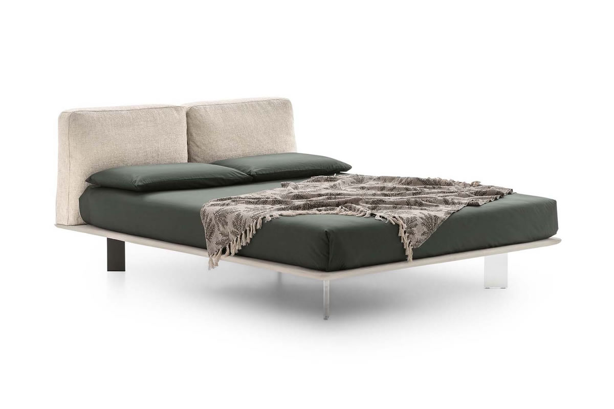 Letto completamente sfoderabile con testiera composta da due cuscini morbidi imbottiti e piano materasso in legno. Il design slim e salvaspazio permette di sfruttare tutta l'area disponibile.