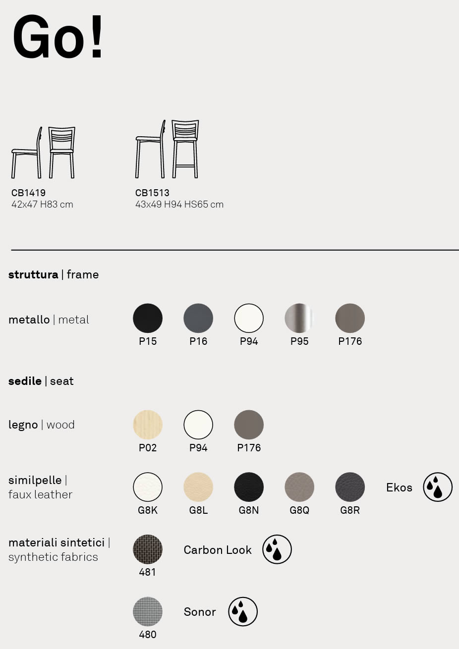 Il sedile è invece disponibile o in legno o in tessuto, nelle finiture elencate nell'immagine sottostante.