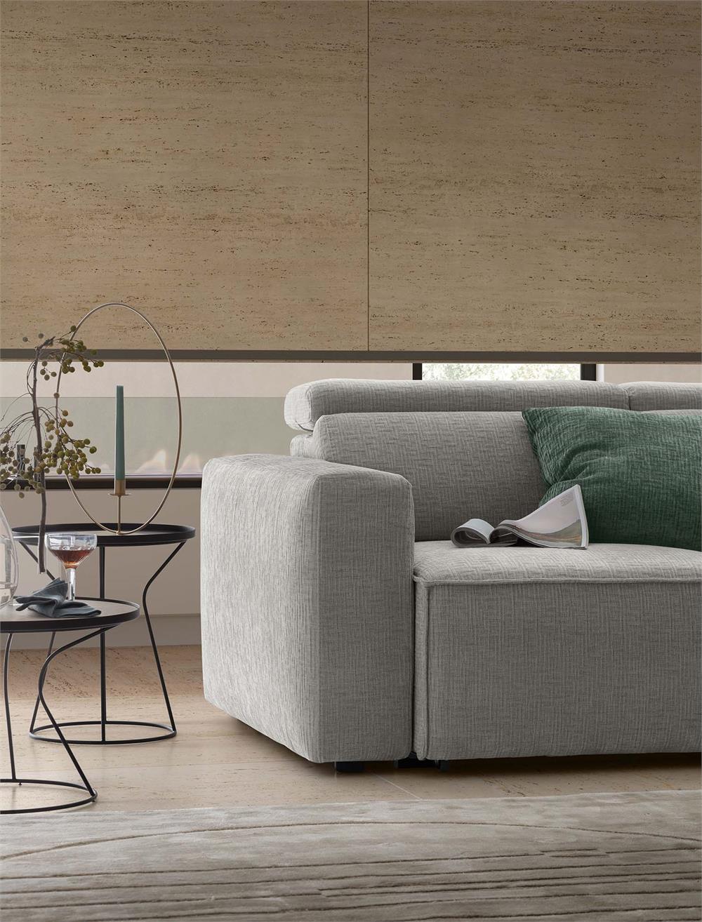 Con sistema di scorrimento della seduta che permette di regolare la profondità del divano.