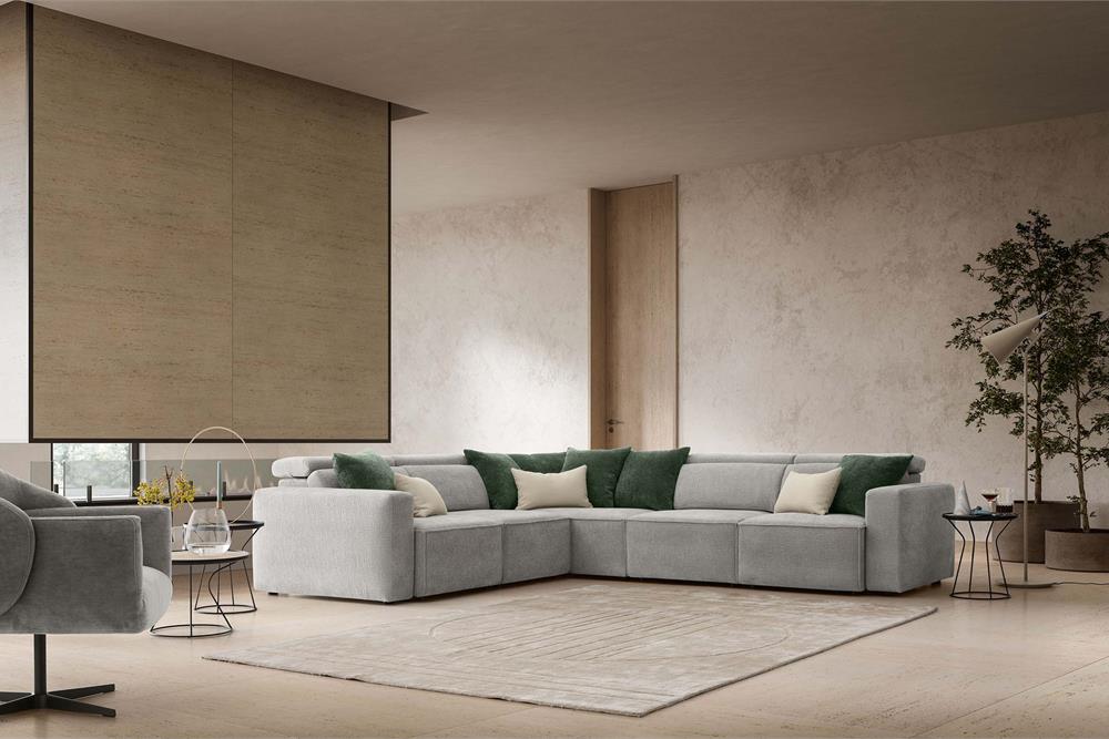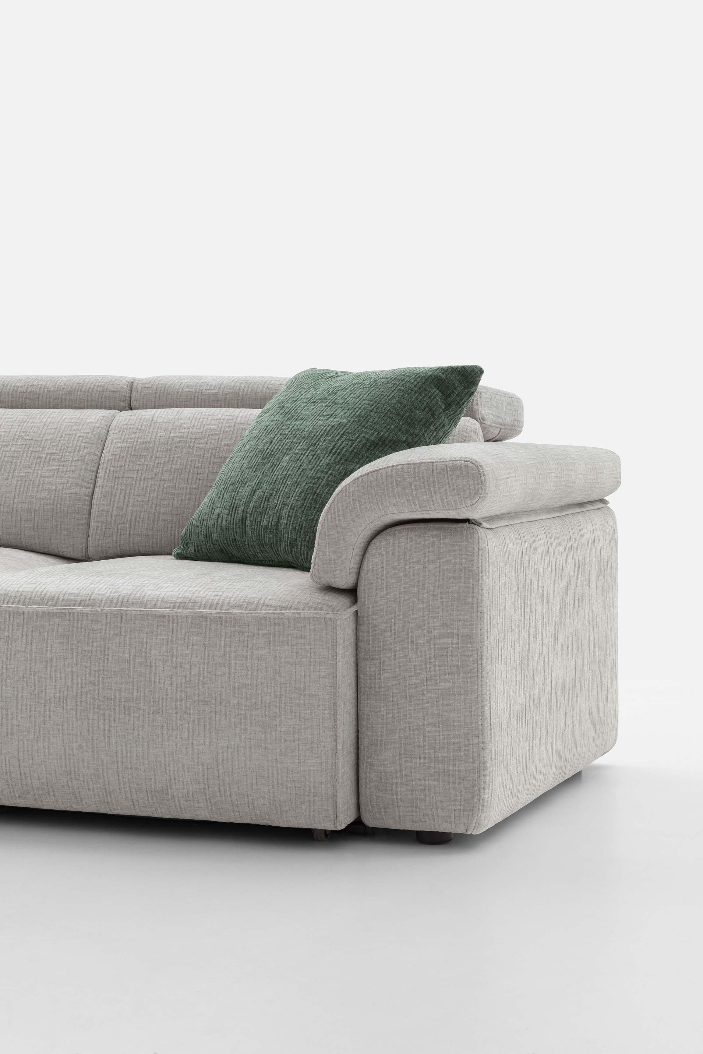 Divano in tessuto angolare con poggiatesta reclinabili.