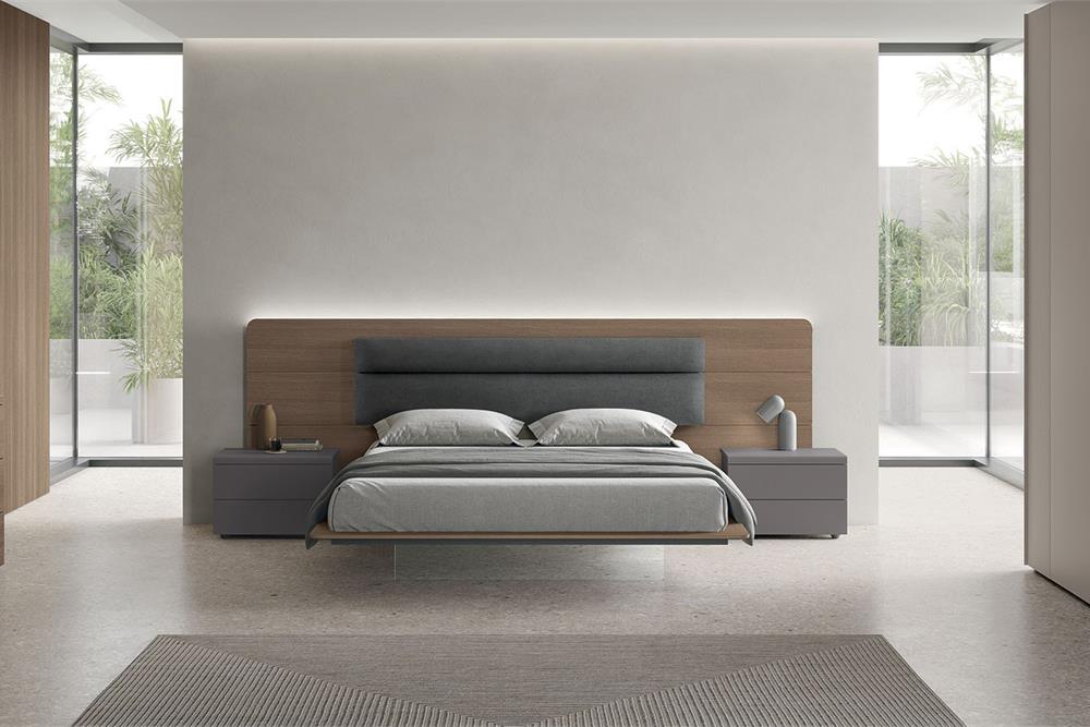 Il letto Leonardo in materico rovere cognac arreda con eleganza l’intera parete.