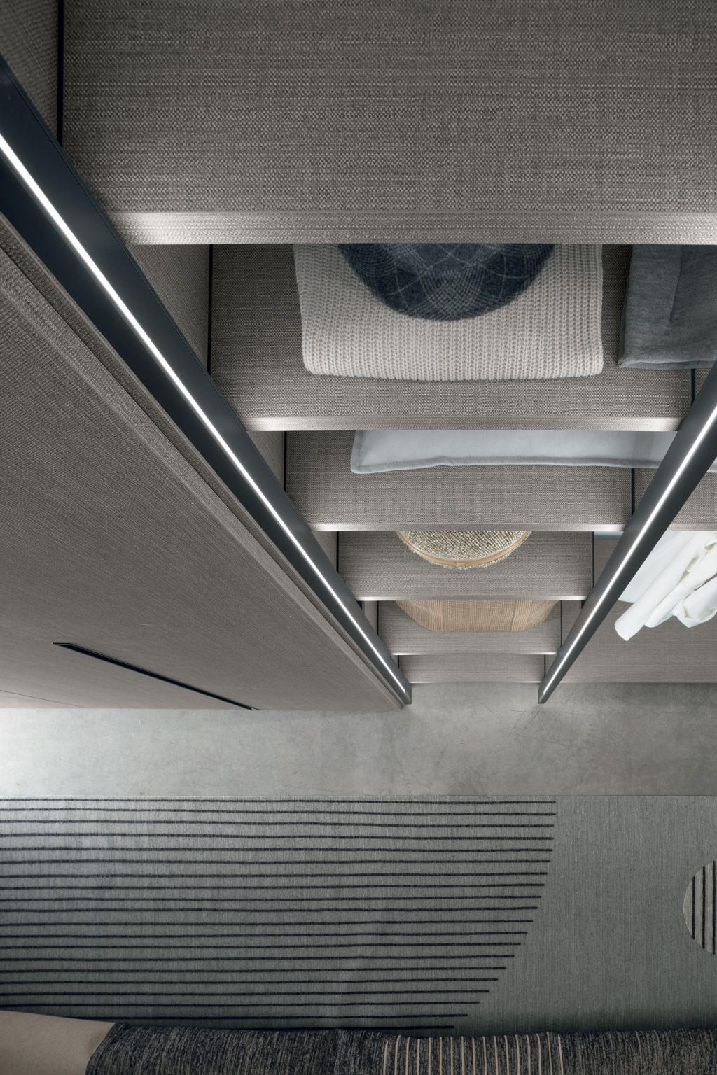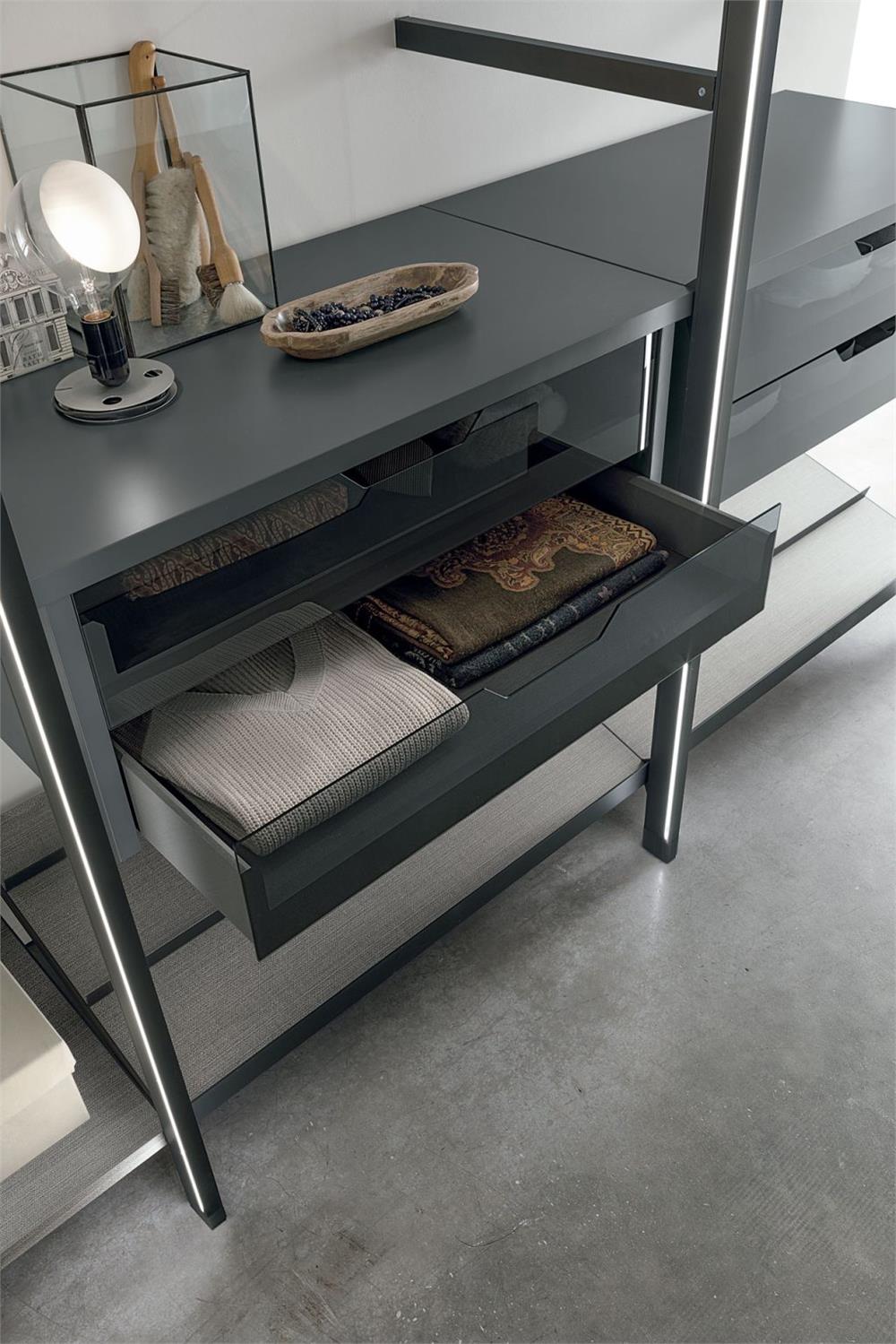 Finiture della foto / Telai metallo antracite. Attrezzature materico alpaca, cassettiere laccato opaco antracite con frontali in vetro.