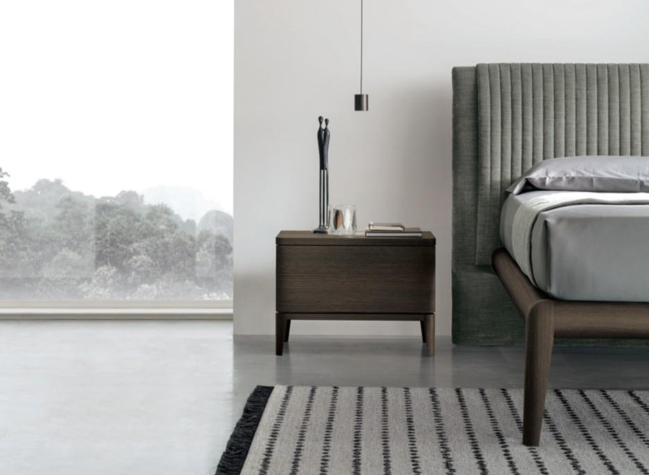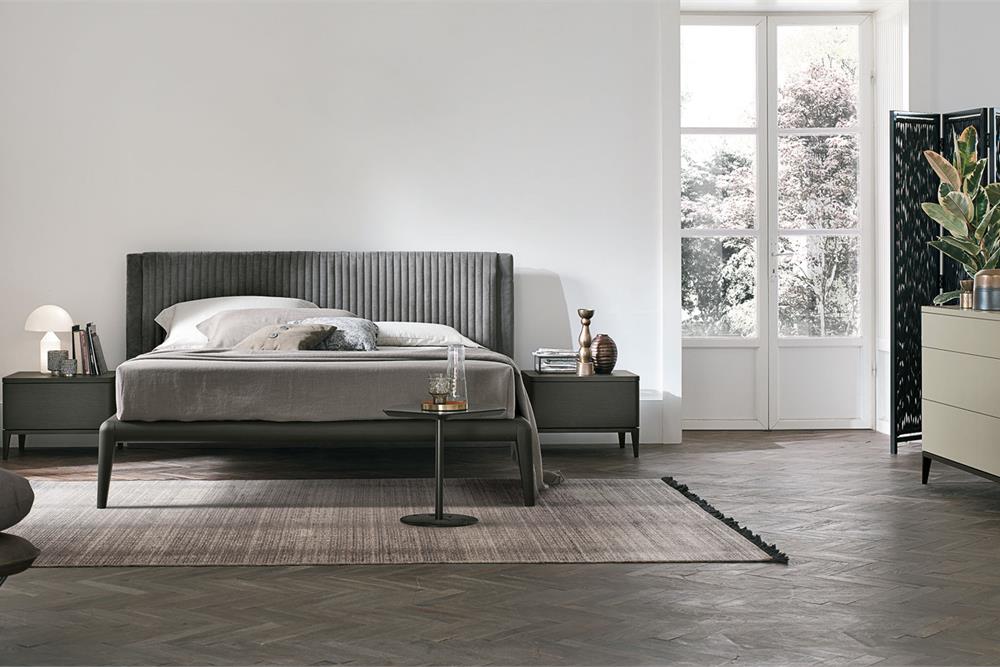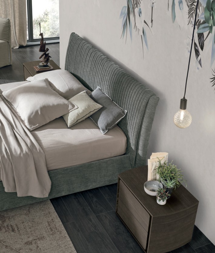 Il giroletto dalle forme arrotondate e la testiera imbottita dalle caratteristiche cuciture verticali arredano una notte dall’atmosfera raffinata.