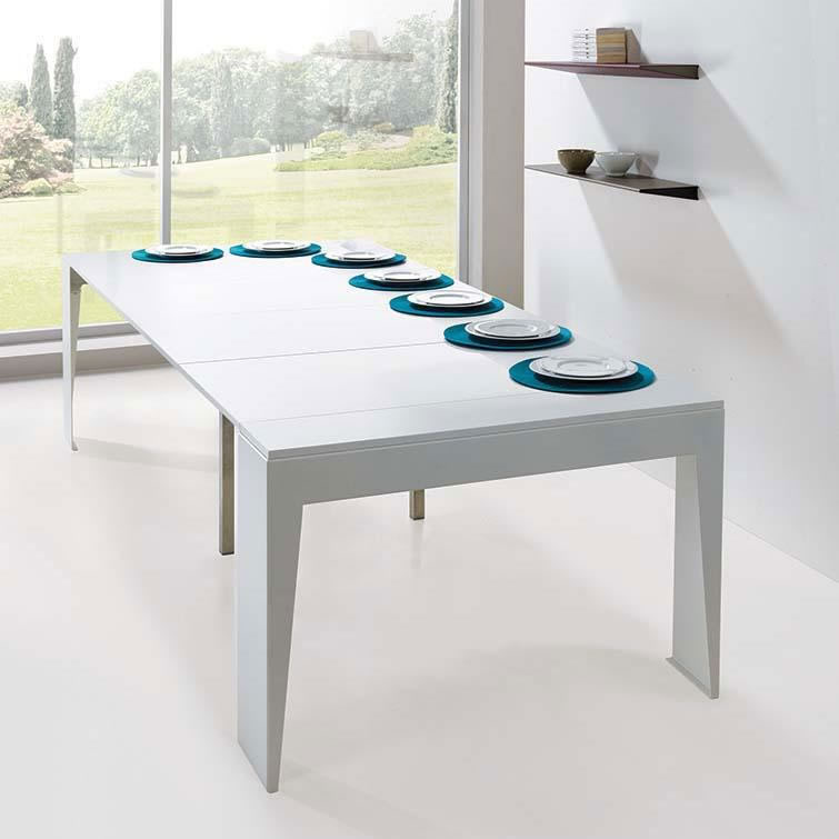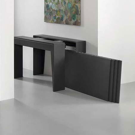 Marvel è la consolle trasformabile in tavolo che contiene le proprie allunghe. Il tavolo viene fornito completo di 4 allunghe (da 60 cm cadauna) che trovano alloggiamento all'interno della struttura e diventano il fondo della consolle integrandosi perfettamente nella stessa. Ha la struttura in lamina d'acciaio verniciato con finitura sablé e il top in laminato ecologico spessore 18 mm. La guida estensibile è in alluminio e le gambe di sostegno pieghevoli sono in acciaio inox.