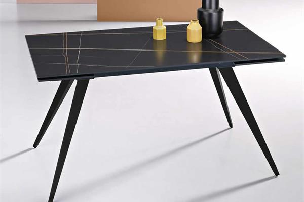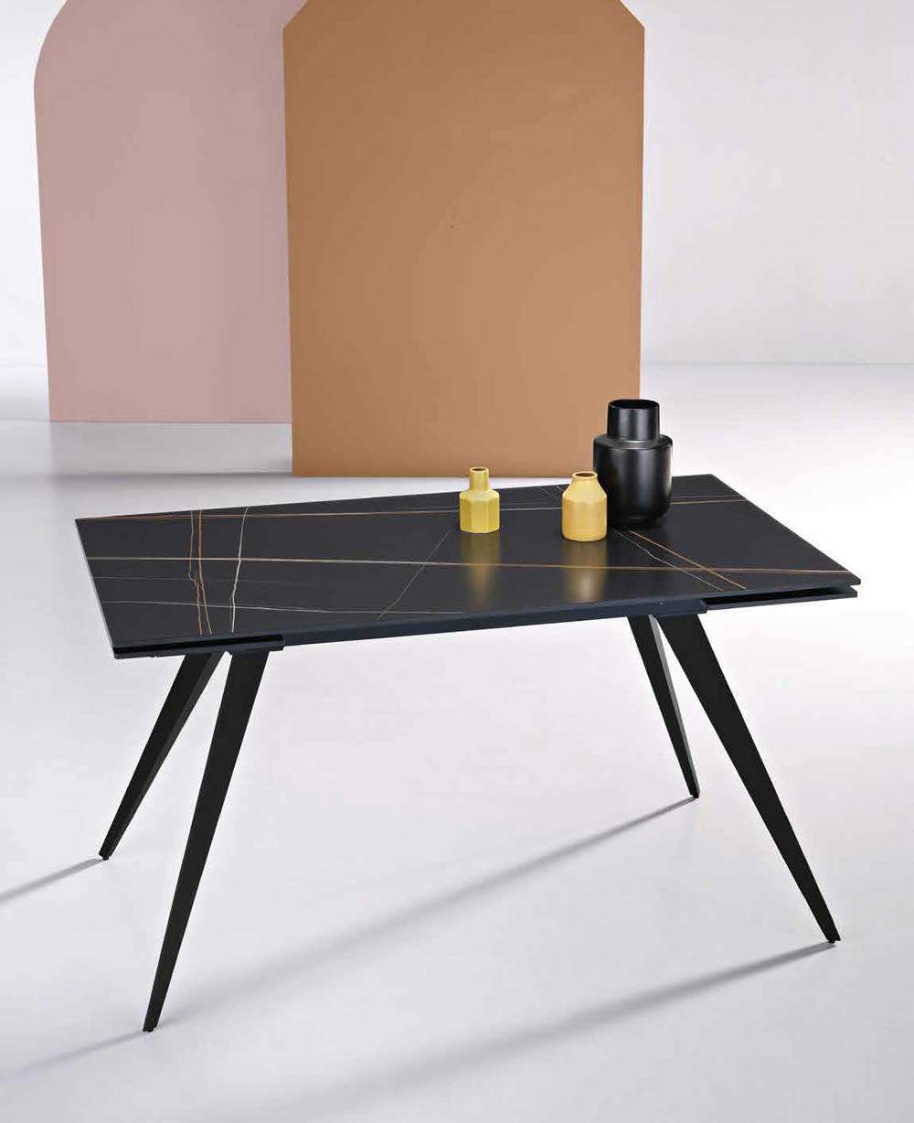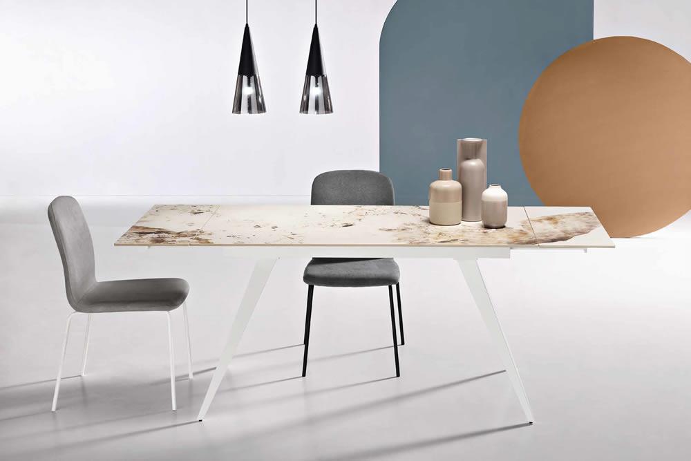 Tavolo con gambe inclinate in metallo verniciato e piano in pietra sinterizzata effetto marmo.