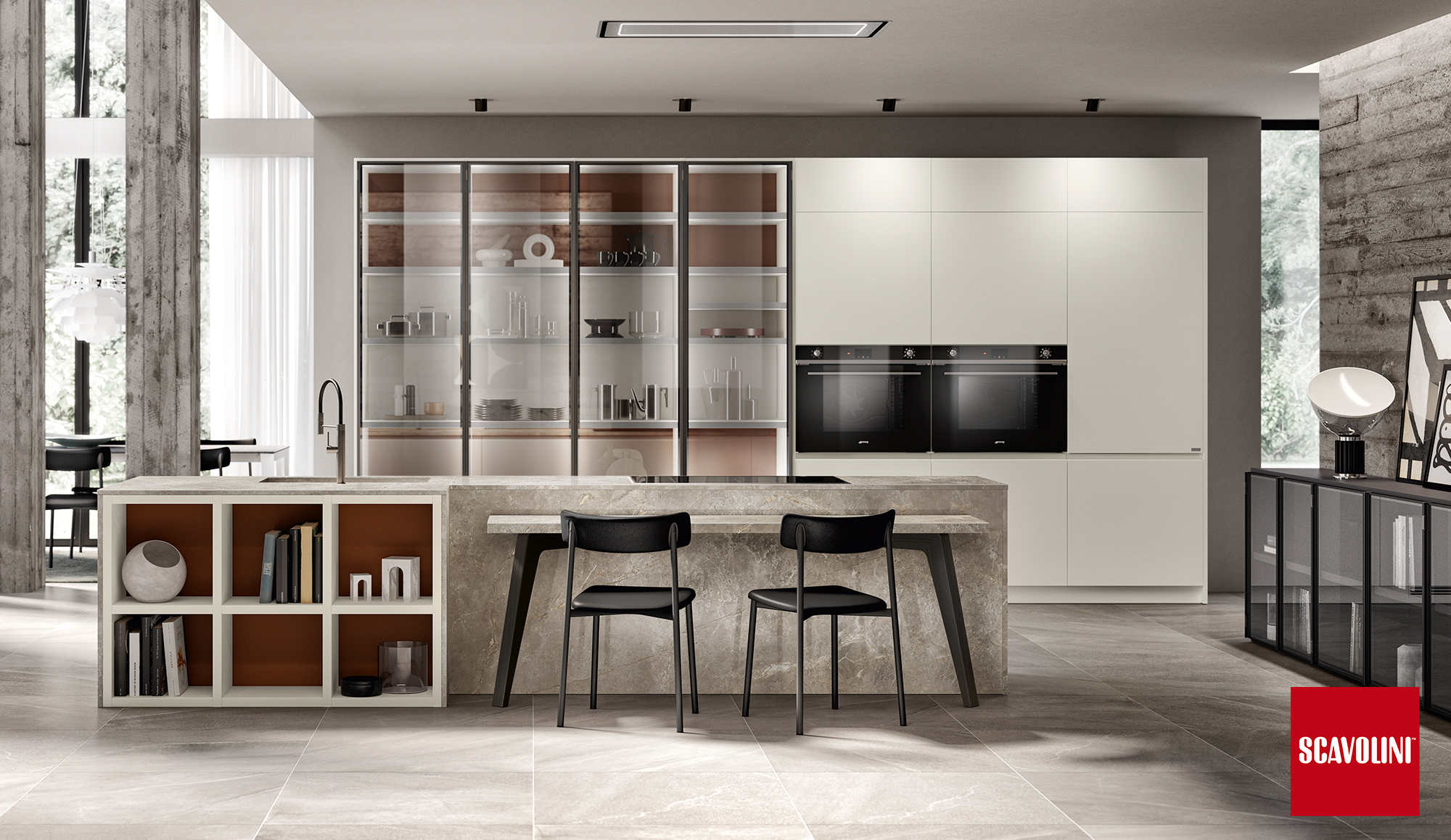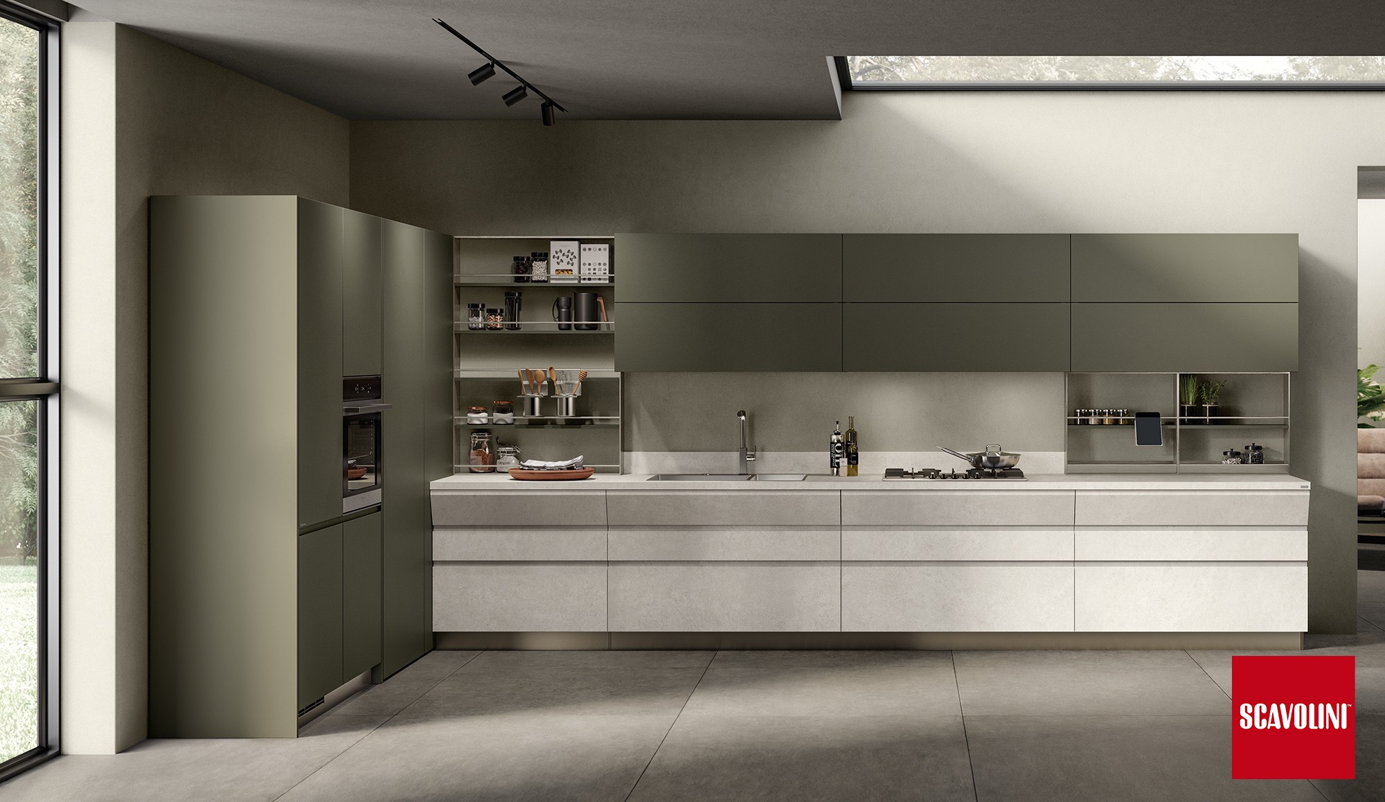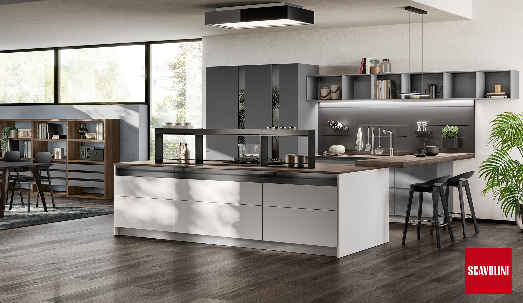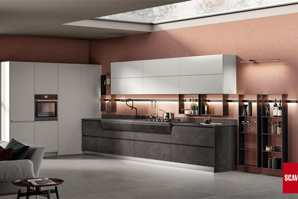 Il progetto Motus di Scavolini, disegnato da Vittore Niolu, coniuga funzionalità e convivialità, privato e socialità.