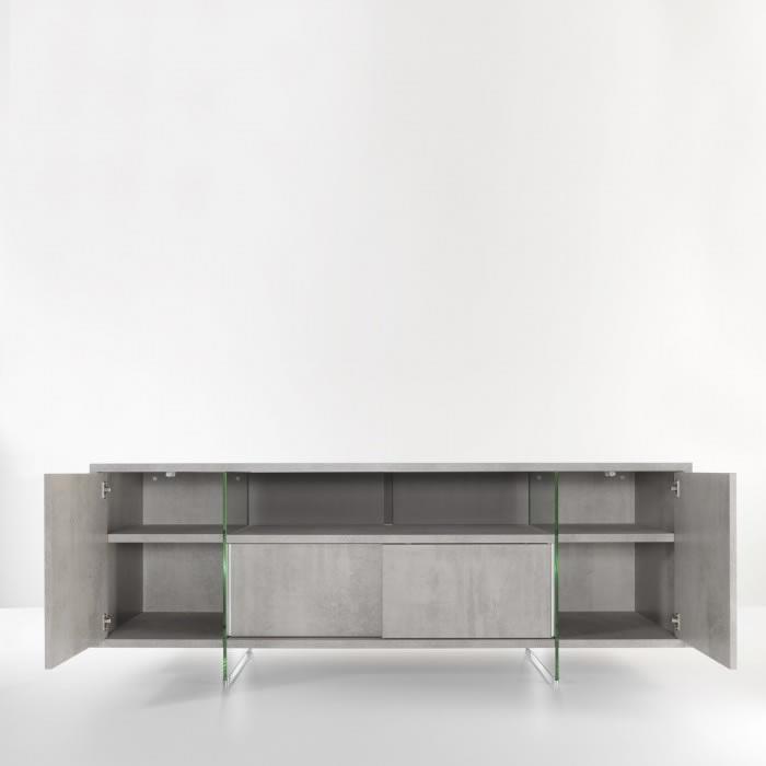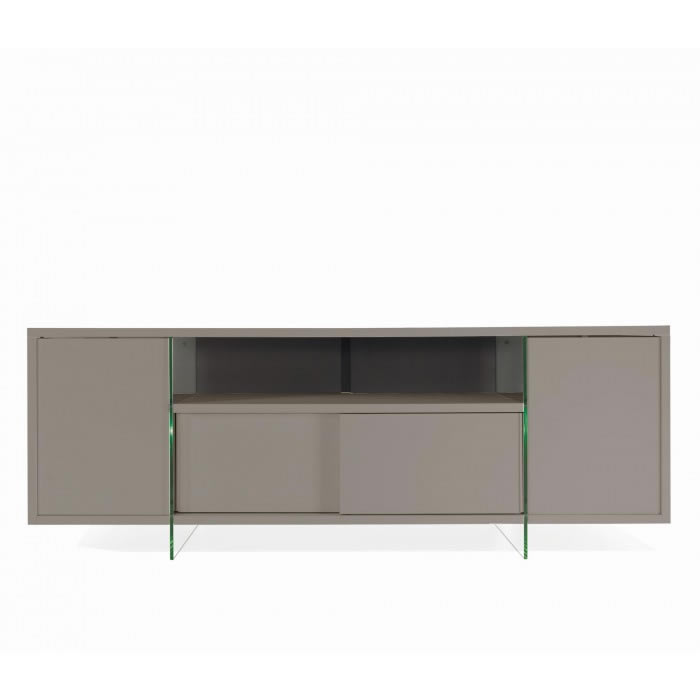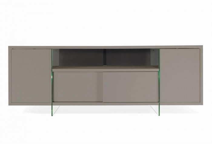 Gli originali montanti interni in vetro consentono di vedere in trasparenza all'interno dei contenitori laterali e sollevano il mobile da terra in modo leggero e originale. Le ante centrali scorrono appese al binario del ripiano superiore, mentre le ante laterali si aprono mediante push-pull.