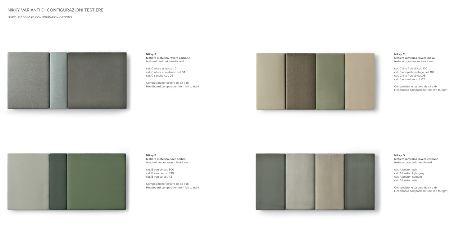 Caratteristica principale del letto Nikki è la presenza di cuscini con diverse configurazioni che fungono da testiera, perfettamente integrati a quest’ultima.