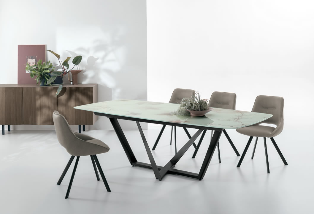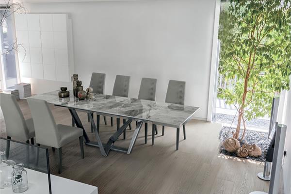Il piano del tavolo allungabile Priamo è disponibile in gres porcellanato oppure fisso in legno, vetro e vetro ondulato in tante finiture e dimensioni (da 160 a 240 cm).
