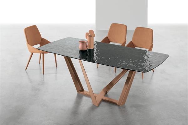 Il basamento di Priamo è un incrocio di direttrici dal forte impatto scultoreo, su cui poggia il piano, fisso o allungabile, dando la possibilità di aggiungere posti a tavola. Un tavolo che coniuga design e praticità.