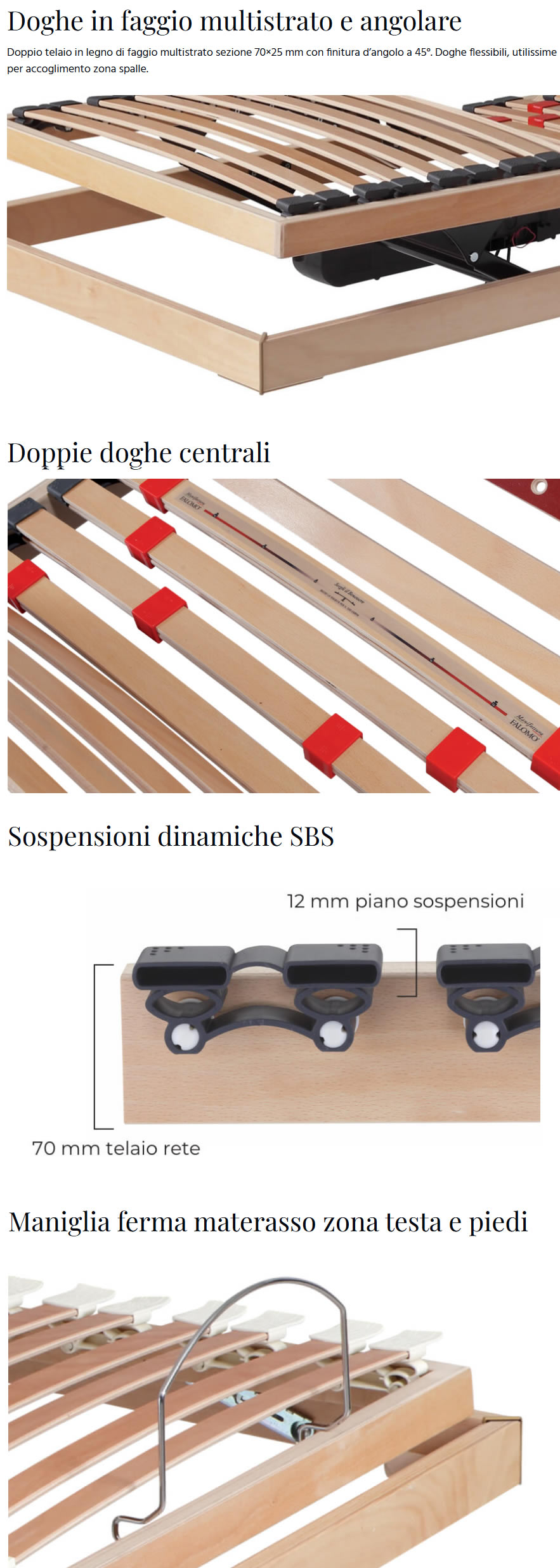 Doppio telaio con doghe in legno di faggio multistrato sezione 70×25 mm con finitura d’angolo a 45°in gomma.