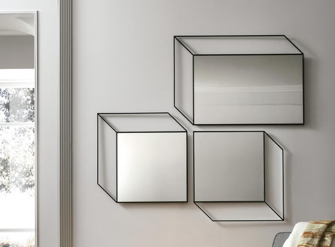 La geometria solida ispira specchiere dalle linee precise: le forme di un cubo e di un parallelepipedo sembrano disegnate sulla parete con un tratto nero e deciso.