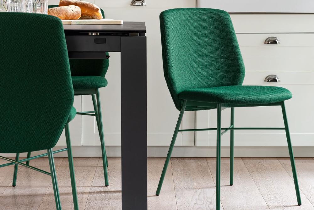 Sedia SIBILLA, con fusto in metallo, in versione imbottita e rivestita in tessuto non sfoderabile. Moderna e funzionale, è perfetta per la zona dining.