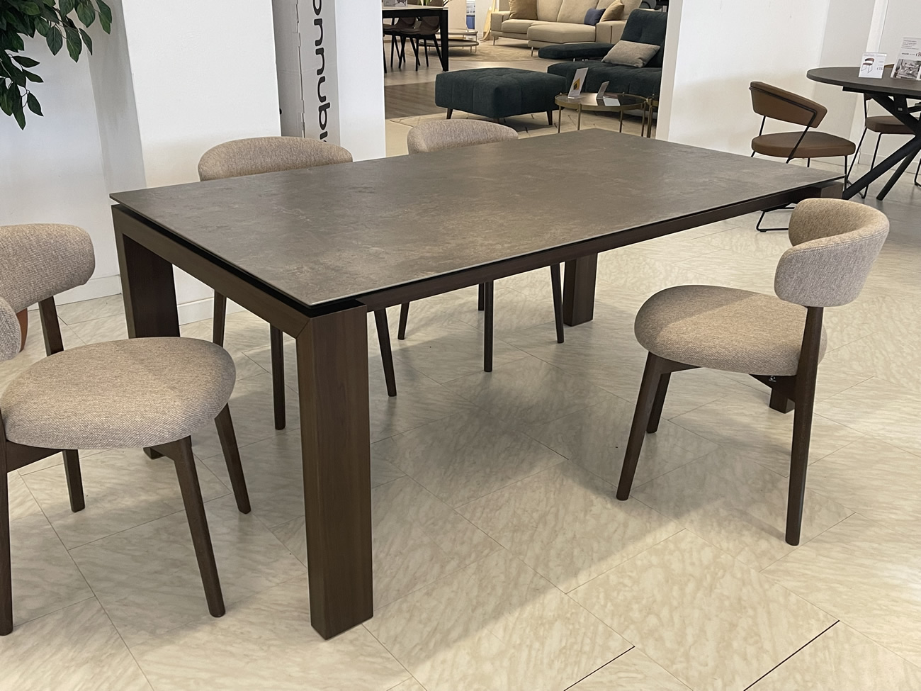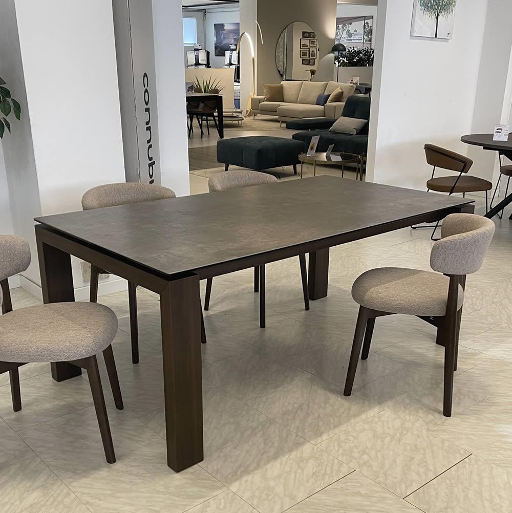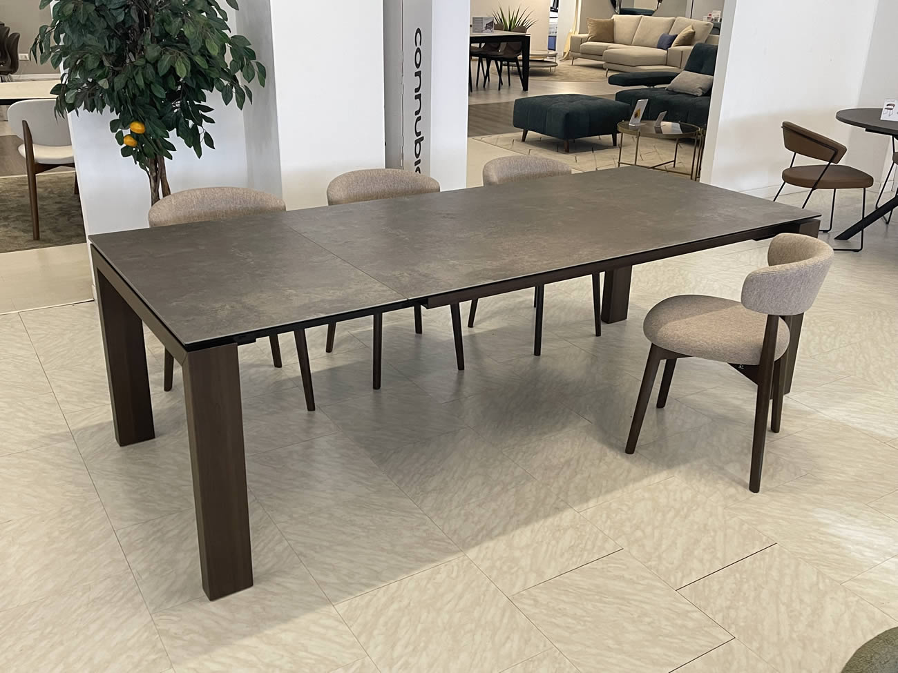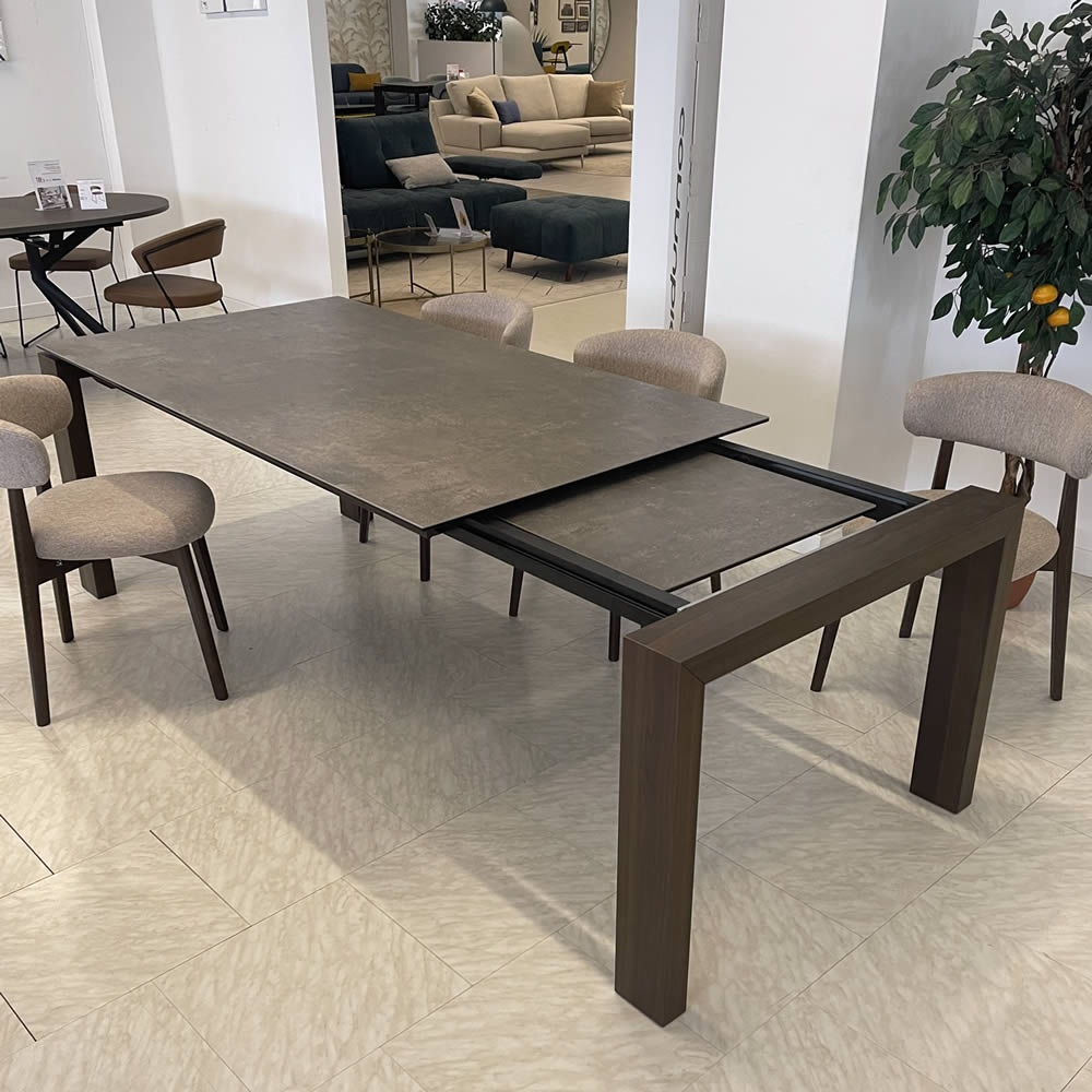 Tavolo allungabile SIGMA: struttura e gambe perimetrali in legno impiallacciato SMOKE, piano rettangolare e allunga in ceramica PIOMBO. Il tavolo SIGMA racchiude al suo interno un ingegnoso meccanismo in grado di ampliare la superficie d'appoggio. Tirando verso di sé la struttura, le due gambe dotate di ruote nascoste scorrono da un lato permettendo di estrarre l'allunga. Con un semplice movimento a rotazione l'allunga montata su binari in metallo esce dal suo alloggiamento e si allinea al piano. Le gambe a sezione rettangolare restano sempre perimetrali garantendo il massimo confort a tutti i commensali.