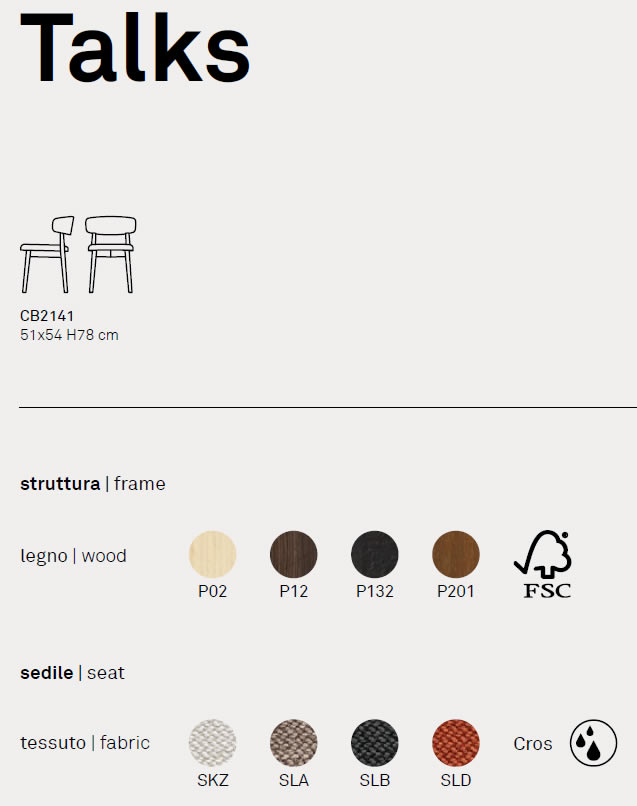 Talks è la seduta per chi ama la compagnia! La struttura in legno dalle sezioni morbide ed arrotondate si combinano perfettamente con la morbida seduta e l’ avvolgente schienale imbottito. Il fusto in legno è disponibile in 4 tinteggiature per offrirvi la massima possibilità di combinazione con il vostro arredo.