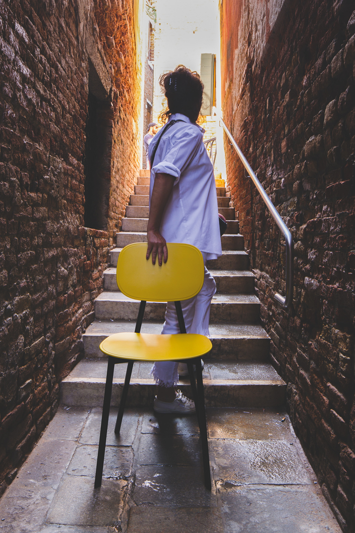 Il nome della sedia prende spunto dalla sua estetica, che ci riporta ai primi anni nelle aule di scuola. La struttura è in acciaio tagliato a laser con giunto in pressofusione di alluminio, sul quale monta lo schienale con un meccanismo a scomparsa. È una sedia moderna che ben si adatta a vari ambienti della casa, così come risulta perfettamente adeguata anche a spazi pubblici. La versatilità e la funzionalità di Tata è accentuata dalla notevole varietà e combinazione di colori e materiali.