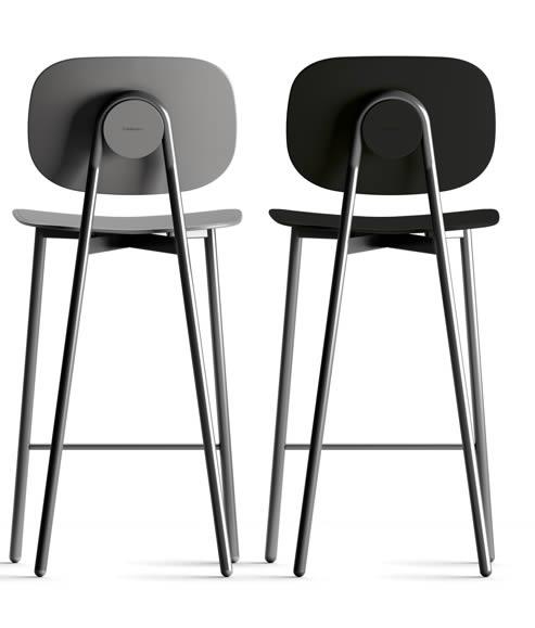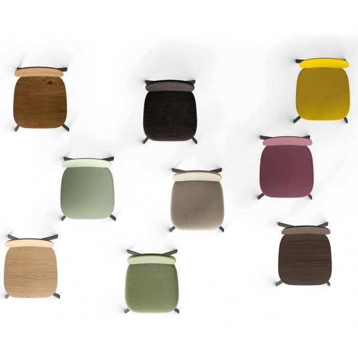 Struttura in tubolare tondo verniciato a polveri epossidiche. Copertura del fissaggio schienale in tecnopolimero, abbinato ai piedini. Seduta e schienale disponibili in polipropilene rinforzato in fibra di vetro, in multistrato nobilitato melamminico o rivestito in tessuto di diversi colori e trame.