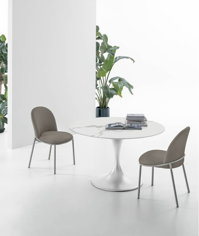 Jazz è l’essenza del design raffinato: un tavolo rotondo che coniuga stile essenziale e dettagli ricercati. Il basamento centrale in metallo verniciato, dal profilo scultoreo che richiama la forma di una tromba, sostiene un piano effetto marmo dalle linee pulite e senza tempo.