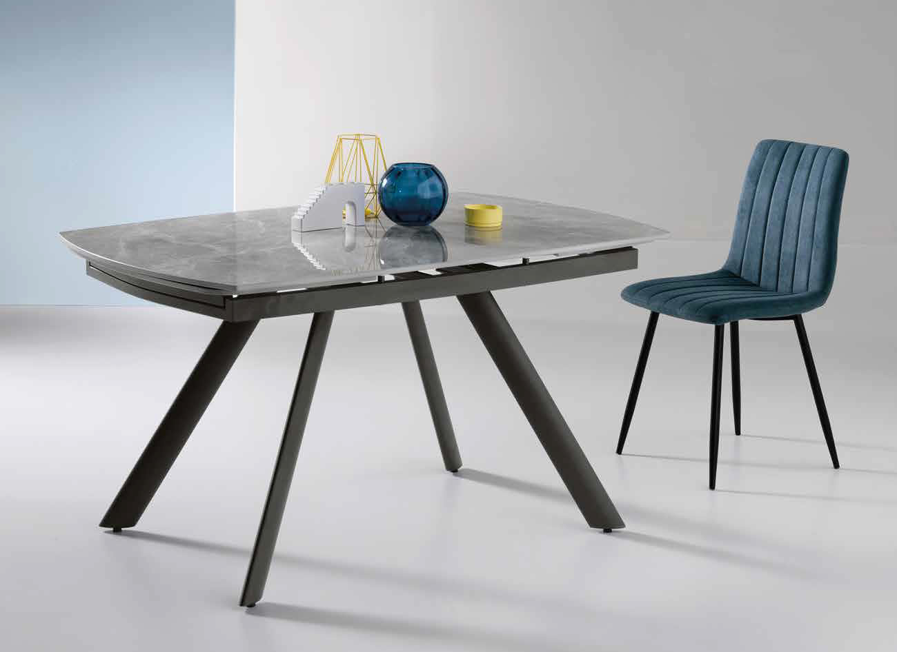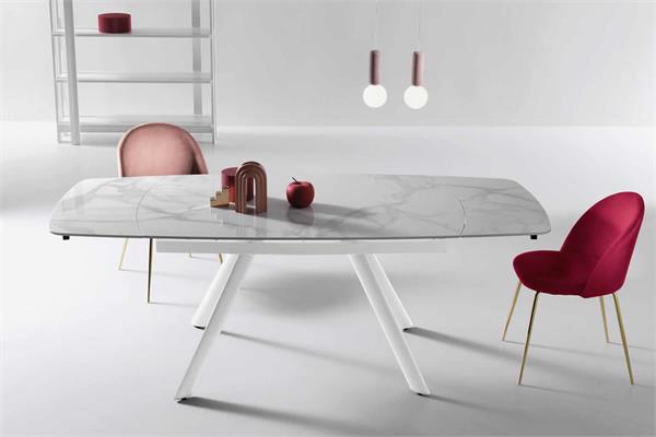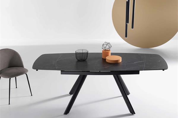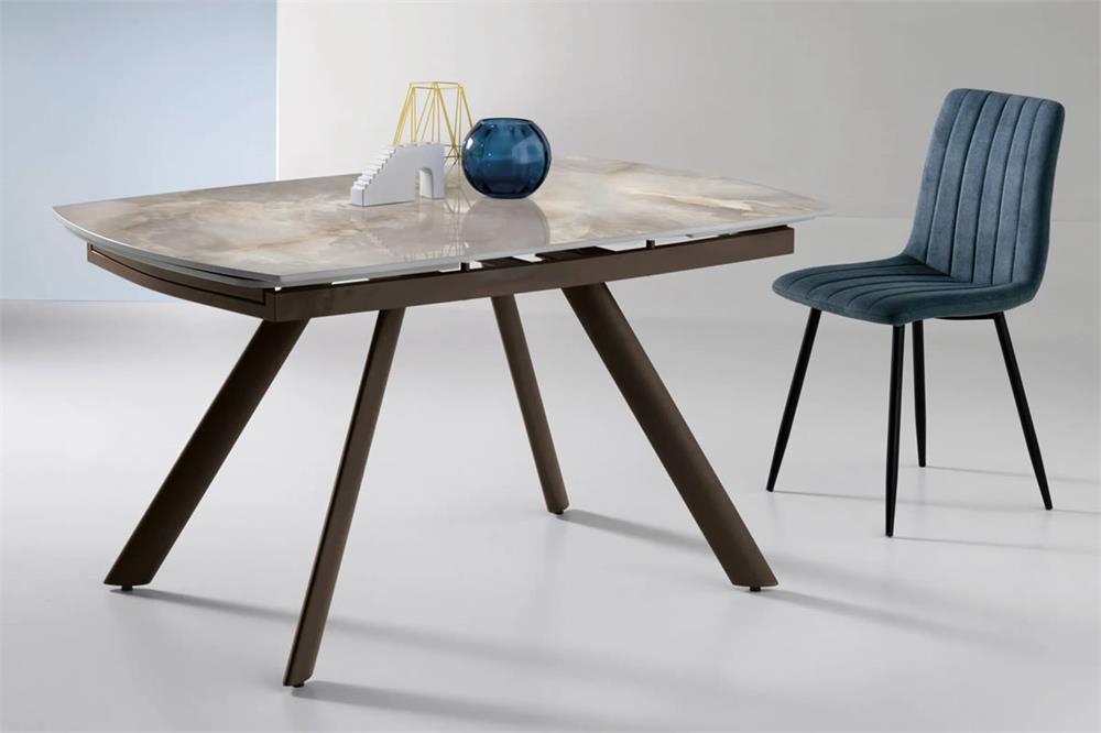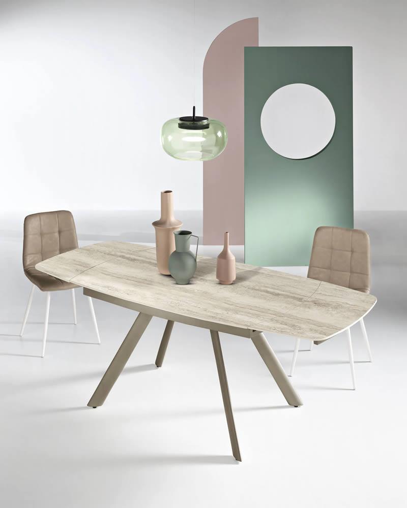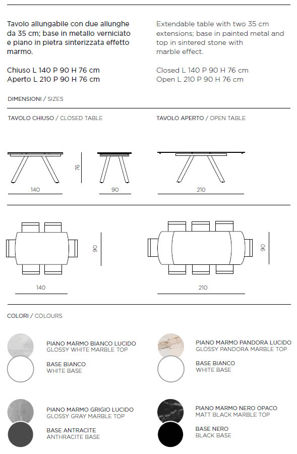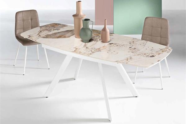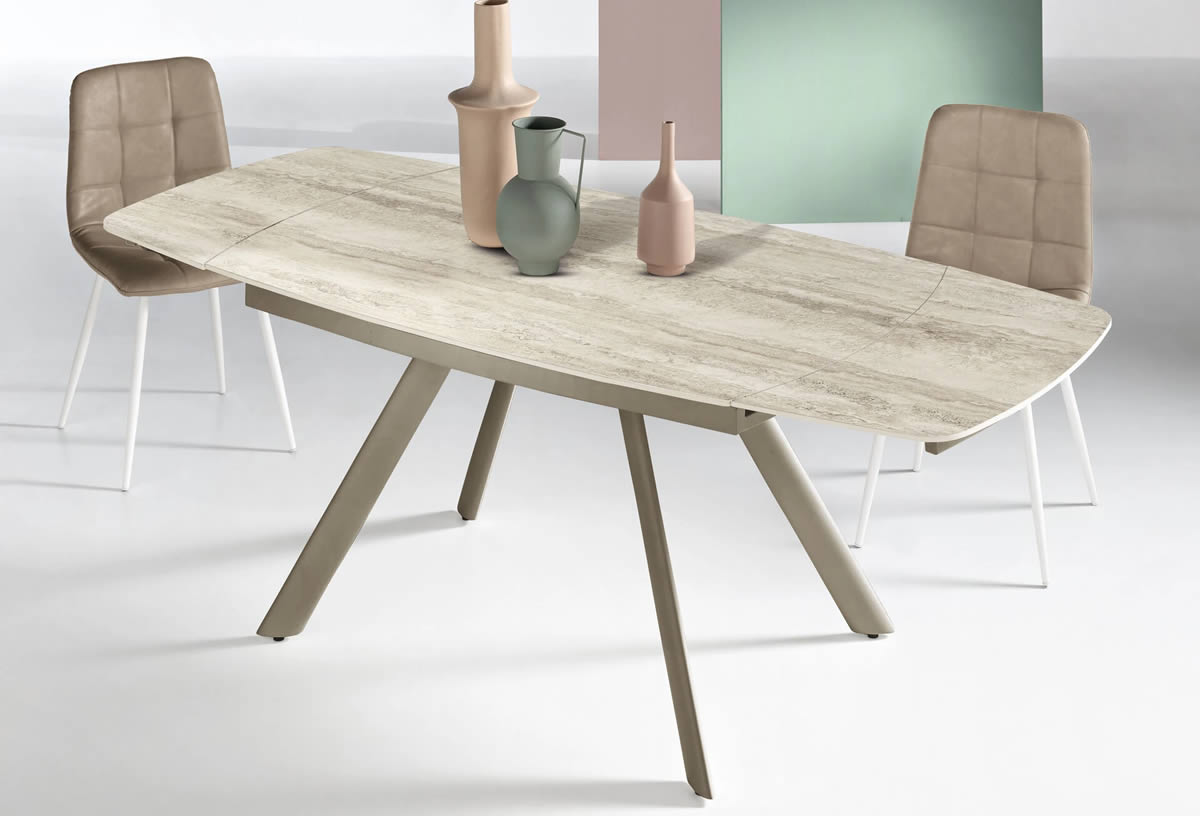 Tavolo allungabile con due allunghe da 35 cm.Base in metallo verniciato e piano in pietra sinterizzata effetto marmo.