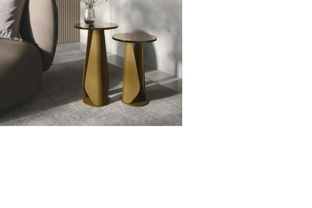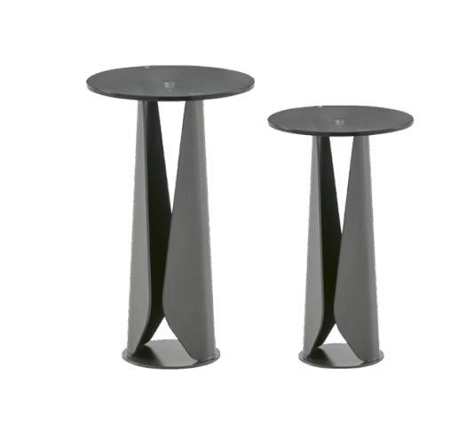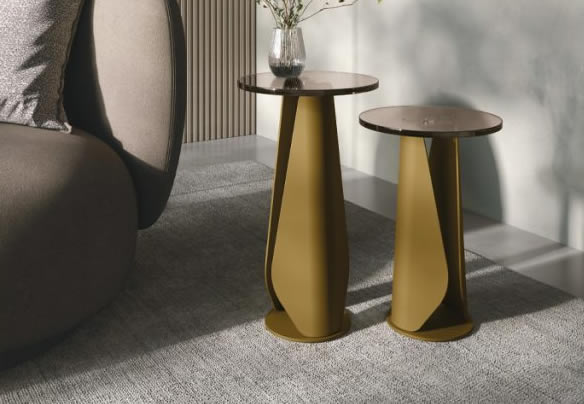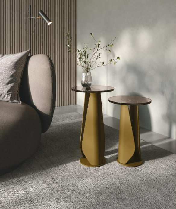 Due forme in metallo ripiegate ai lati fanno da base al piano in vetro. Due diverse altezze per una coppia di tavolini angolari che, di fianco a una comoda poltrona o a un divano, dà vita ad un angolo lettura con stile.