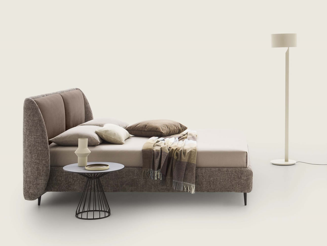 Letto con struttura imbottita completamente sfoderabile. Ali laterali avvolgenti e curvilinee.