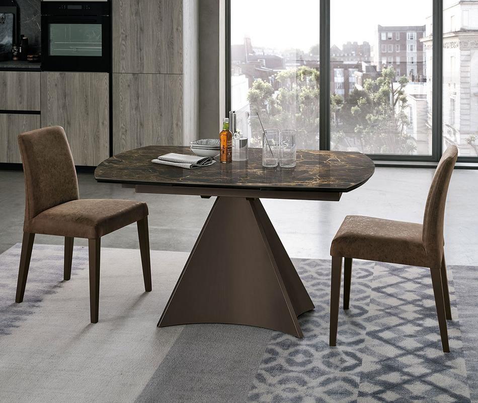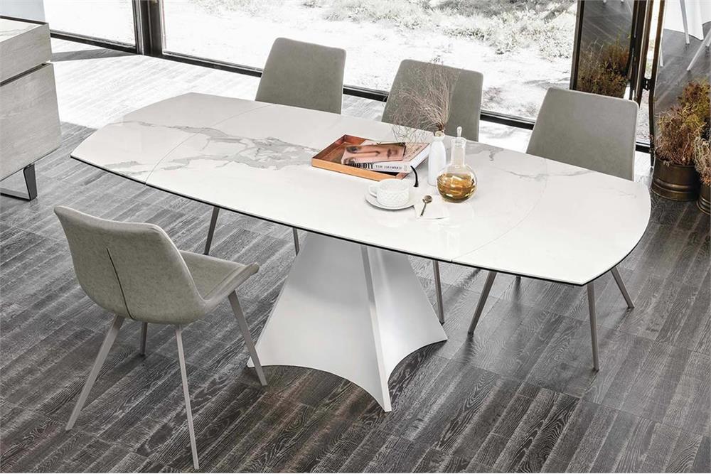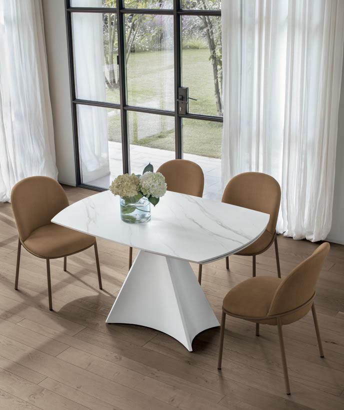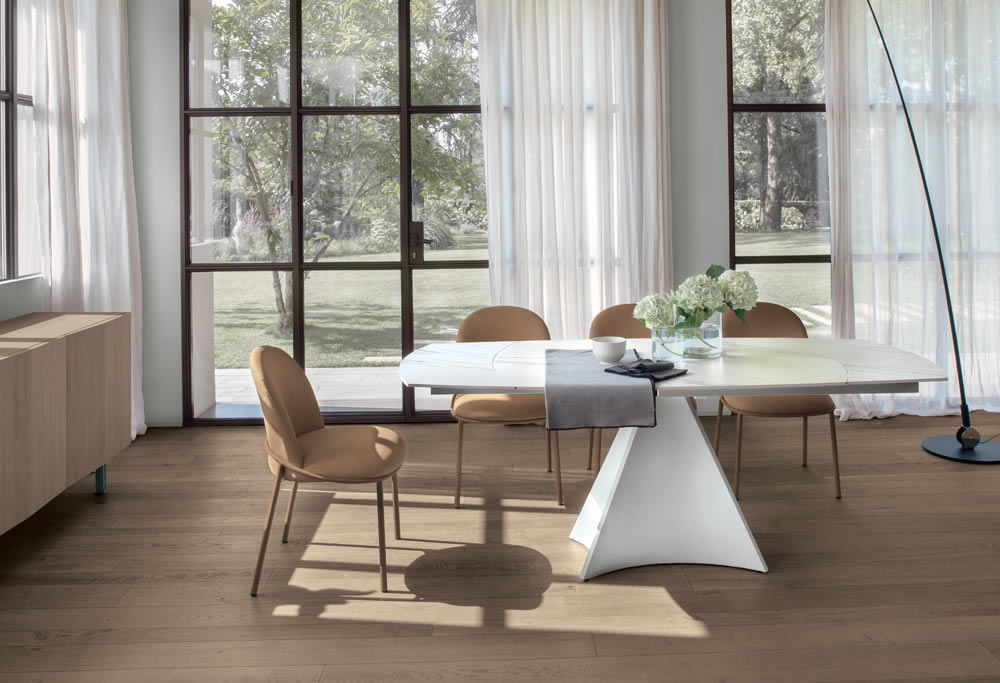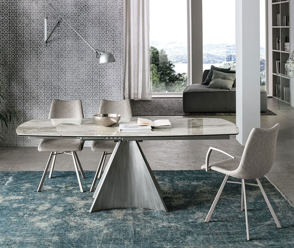 Un semplice gesto permette di allungare il tavolo Tornado, con un’imponente base centrale. Il piano a botticella in gres gira sulla base in metallo facendo uscire automaticamente le allunghe laterali. Un sistema intuitivo e veloce, che permette di coniugare estetica e funzionalità.