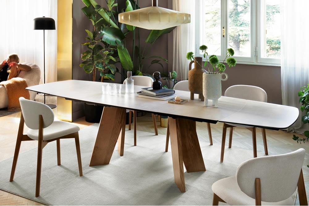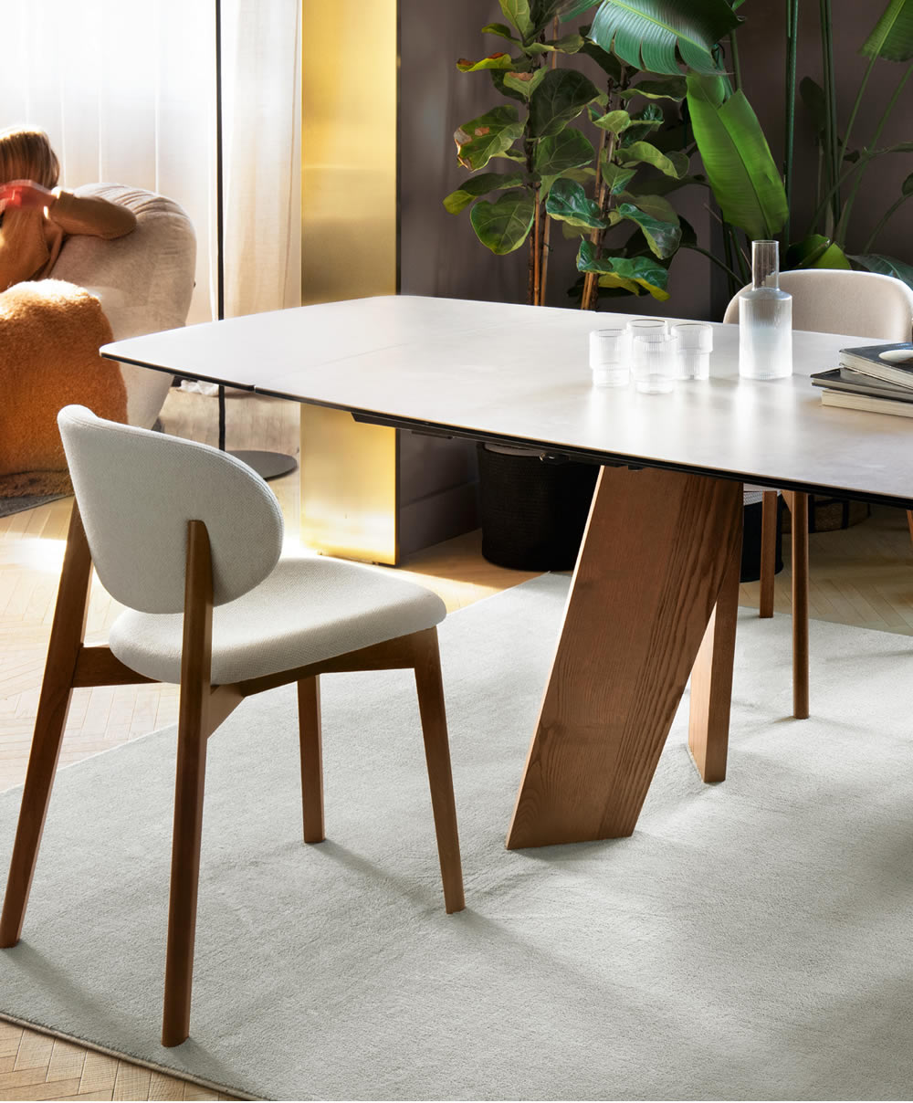Il tavolo Victor si distingue per il suo basamento caratterizzato da due cavalletti in legno di frassino tinto, che creano un segno grafico distintivo e conferiscono dinamismo e slancio visivo all'intero design. Il piano in ceramica, raffinato e resistente, si integra armoniosamente con la base, esaltando il contrasto tra i materiali. L'equilibrio tra solidità e leggerezza rende questo tavolo un elemento di grande impatto estetico, capace di arricchire qualsiasi ambiente con la sua eleganza.