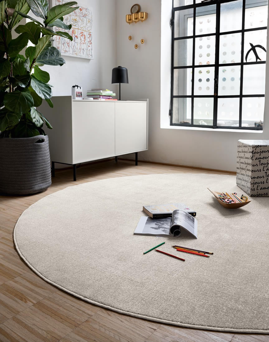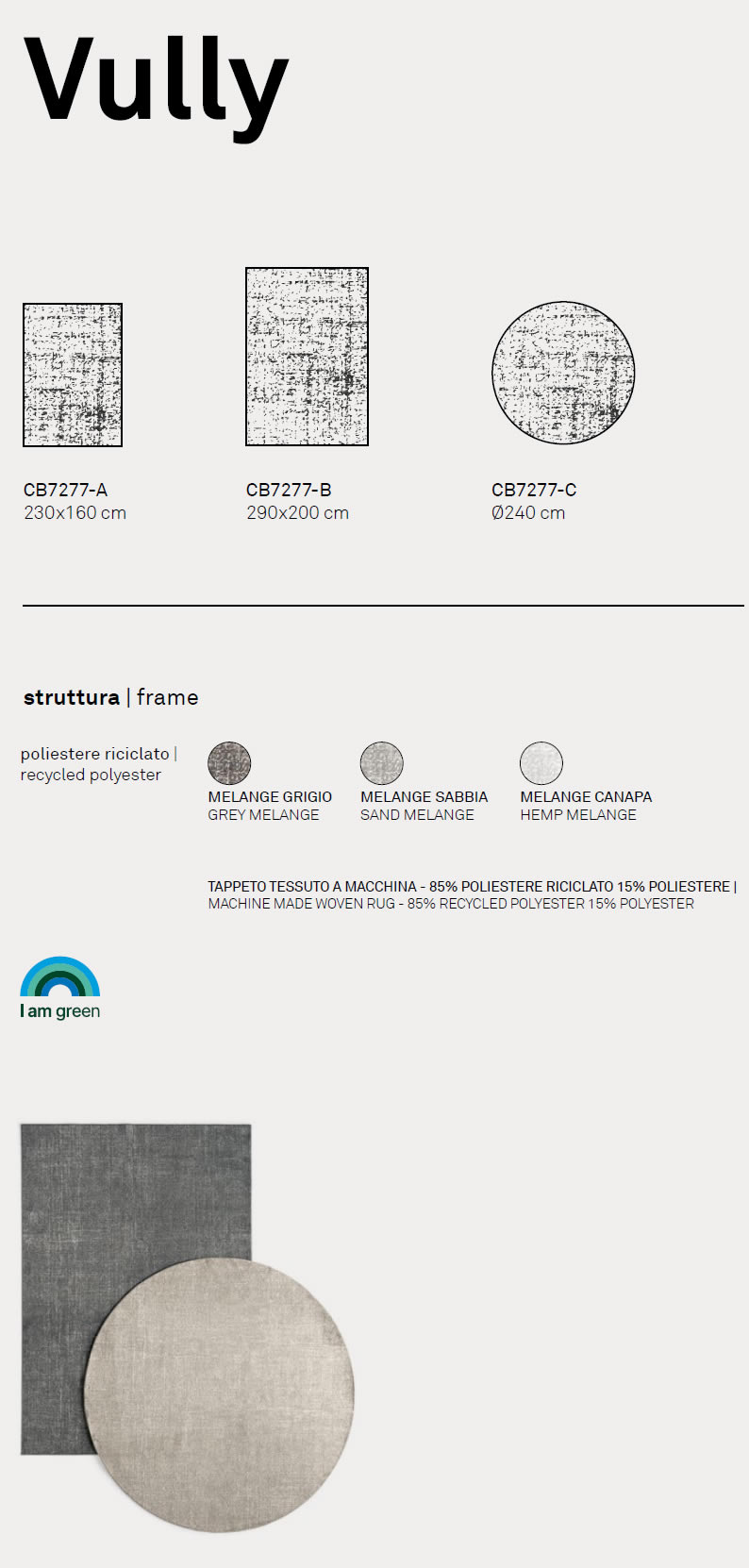 Il tappeto Vully È composto per l'85% da poliestere riciclato, contribuendo così alla riduzione degli scarti e al riciclo dei materiali. Il restante 15% è costituito da poliestere a pelo lungo, che conferisce al tappeto una texture morbida e piacevole al tatto. La varietà di forme e dimensioni disponibili consente di scegliere la soluzione che meglio si adatta alla disposizione del tuo spazio, offrendo flessibilità e possibilità di personalizzazione.